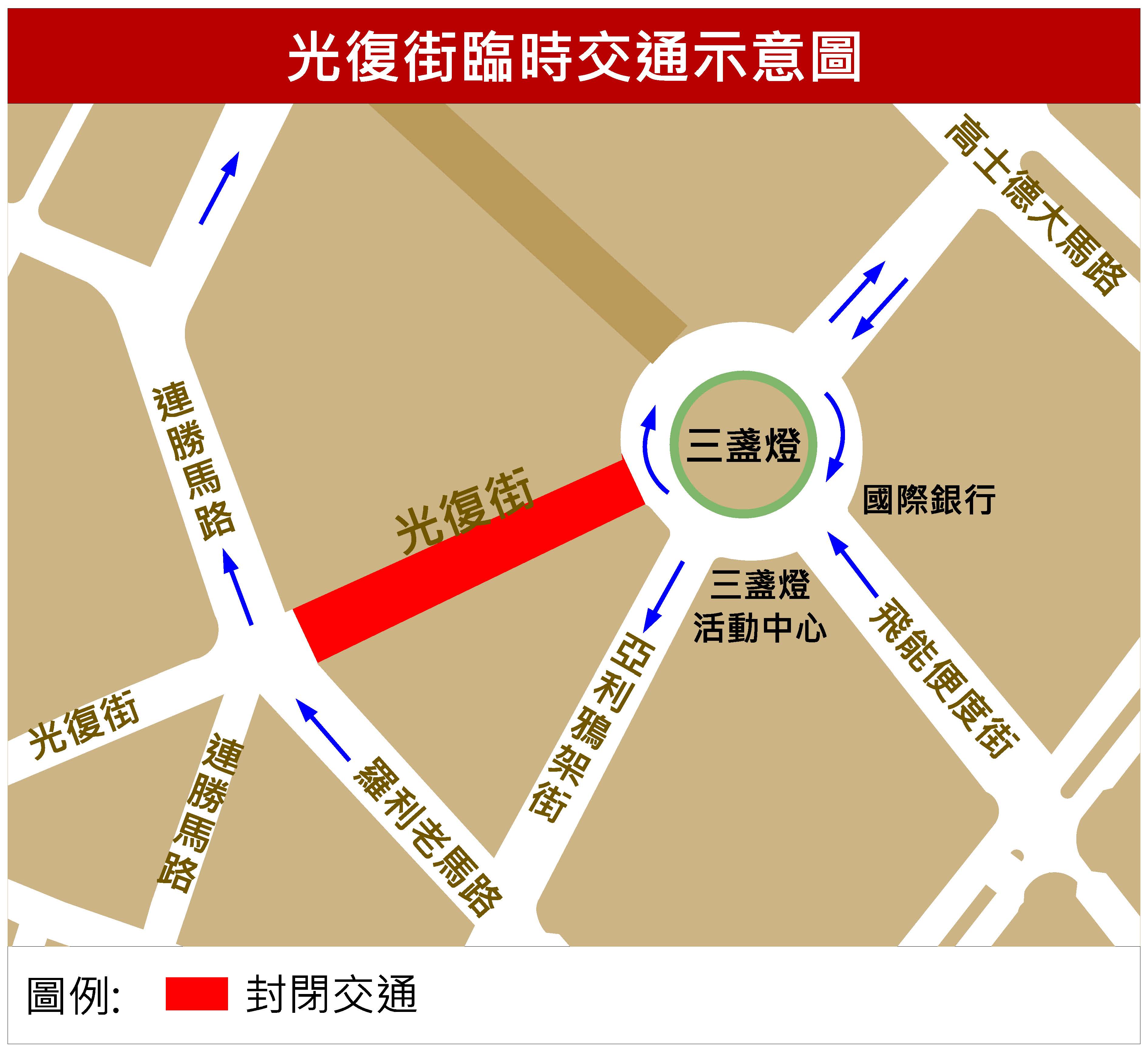 另外,因進行吊運及起卸工作,本月12日(周六)上午9時至下午1時,介乎三盞燈與連勝馬路之間的一段光復街實施封閉交通,部份咪錶泊車位暫停使用。而當日晚上7時至10時,西墳馬路亦會實施封閉交通,並禁止車輛停泊,以進行巴士站地線翻新工作。期間,“西墳馬路”及“社會工作局”巴士站暫停使用,7(往祐漢第二街)、7A(往東方明珠)及8(往青洲)路線原線駛至荷蘭園大馬路後,改經塔石廣場地下行車隧道往高士德大馬路方向行駛,及後左轉入賈伯樂提督街至賈伯樂提督圓形地後按原線行駛,並臨時停靠“東南小學”巴士站。