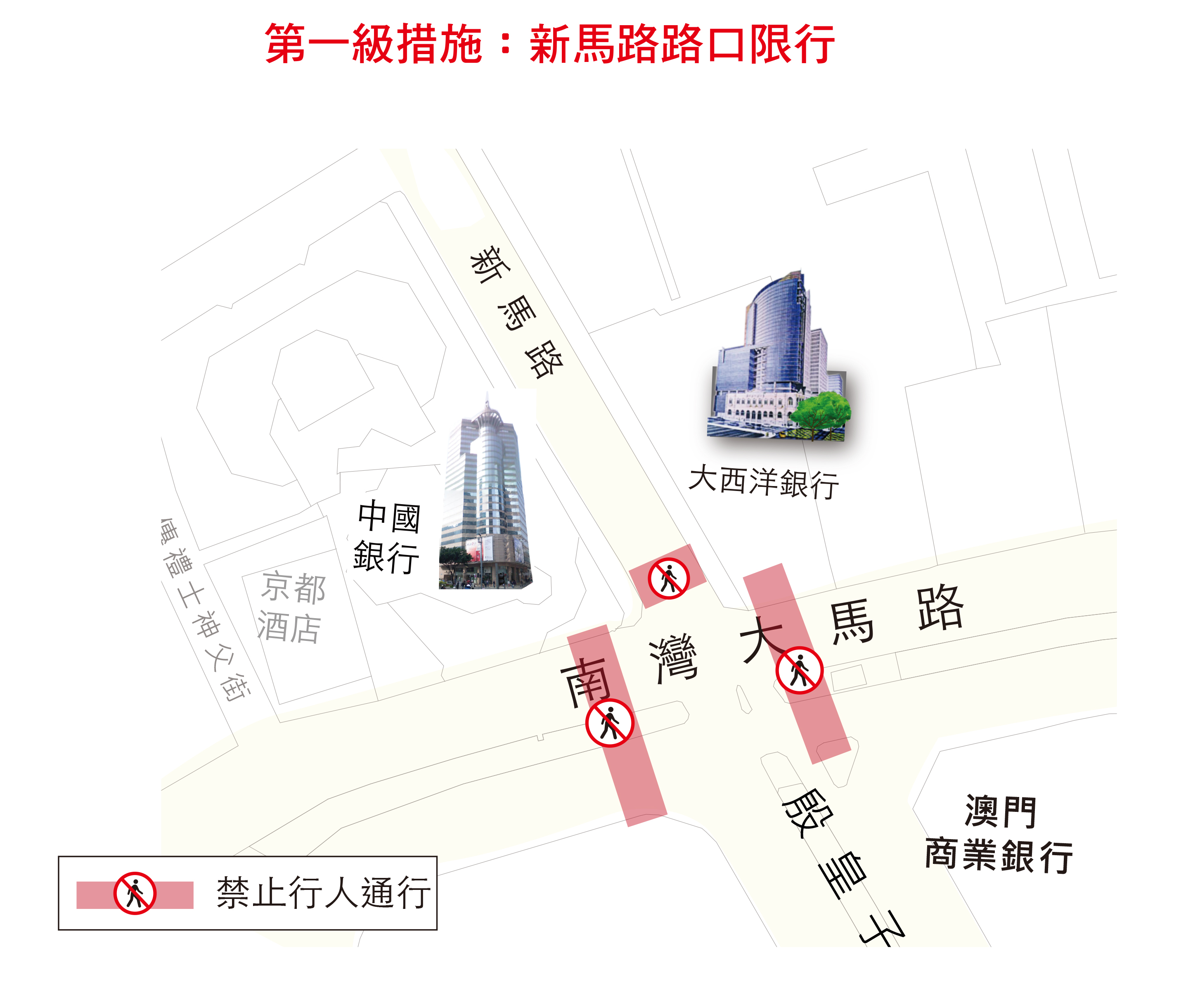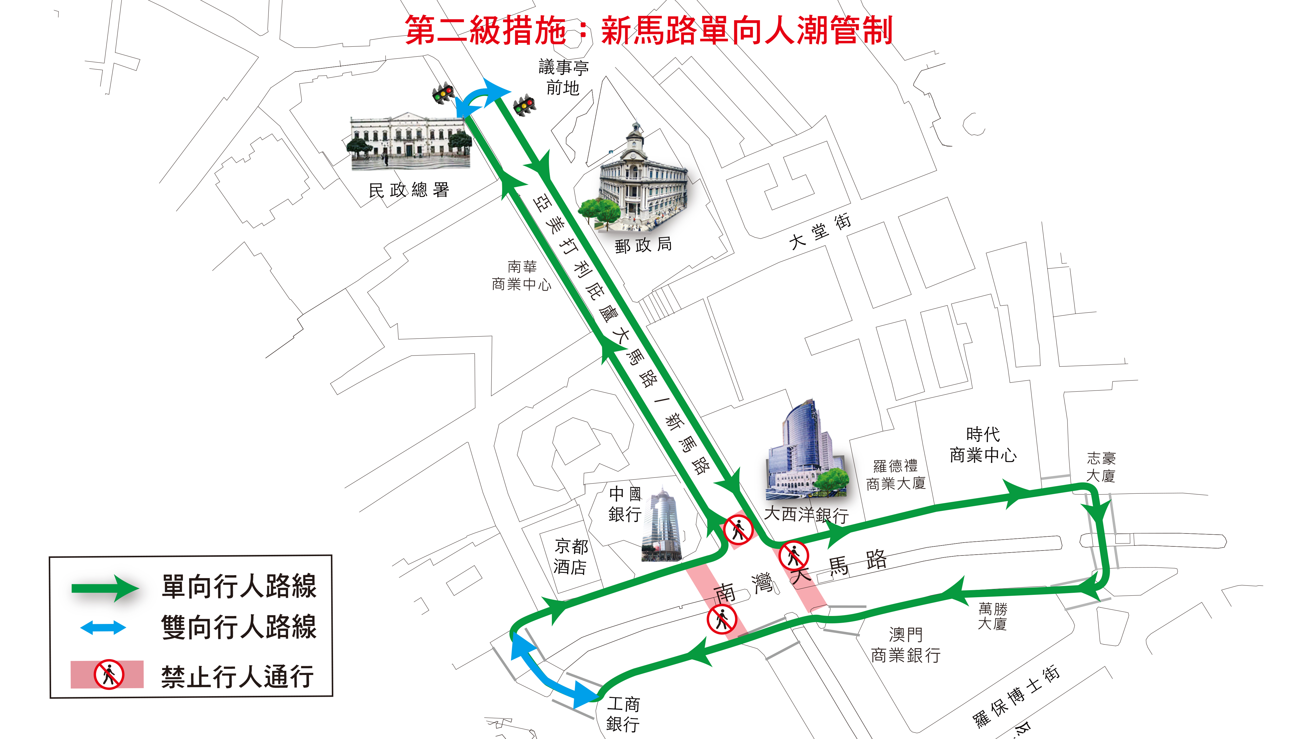 當第一級措施未能解決人群持續擠擁問題時,在第一級的基礎上,新馬路將實施單向人潮管制。行人需遵照附圖所示‘倒T’字型單向行進路線前往議事亭前地、大西洋銀行、滙豐銀行、商業銀行、工商銀行、中國銀行及民政總署等地點。
