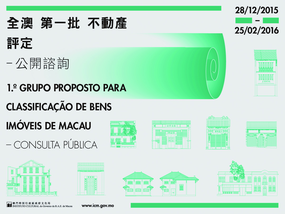 文化局日前根據《文化遺產保護法》的規定,對首批共十個不動產項目啟動評定程序。文化局將於十二月二十八日至二零一六年二月二十五日進行為期六十日的公開諮詢,首場公眾諮詢會將在一月九日下午三時在大炮台澳門博物館演講廳舉行,歡迎市民踴躍發表意見。