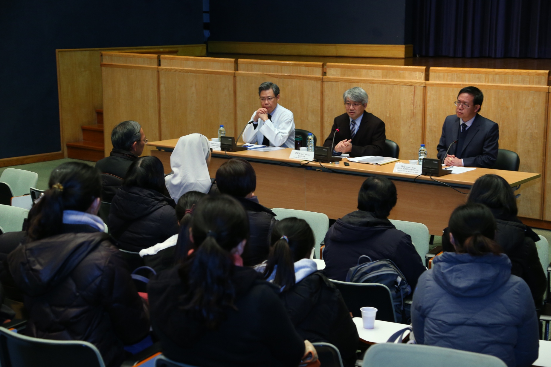 在參觀結束後,衛生局李展潤局長、仁伯爵綜合醫院郭昌宇院長、疾病預防控制中心林松主任,與一眾教職員進行面談,聽取意見。衛生局李展潤局長,分享了2003年“沙士”期間本澳醫護人員如何齊心協力為抗疫購置物資和臨時設備的經驗,並感謝醫護團隊在面對傳染病威脅時,冒著受傳染的危險,仍敢於承擔救治傳染病人的責任;他又重申,必須為未來可能出現的傳染病作好準備,興建傳染病大樓,既為了向醫護人員提供安全工作的條件,亦為了給鄰近學校、居民更好的保障。楊子秋校長表示,藉著是次參觀有助瞭解整個傳染病防治工作流程,建議衛生局加強向社會大眾進行推廣,例如透過宣傳片傳遞相關資訊;另外,該校暫時沒有收到家長反對興建傳染病大樓的意見。