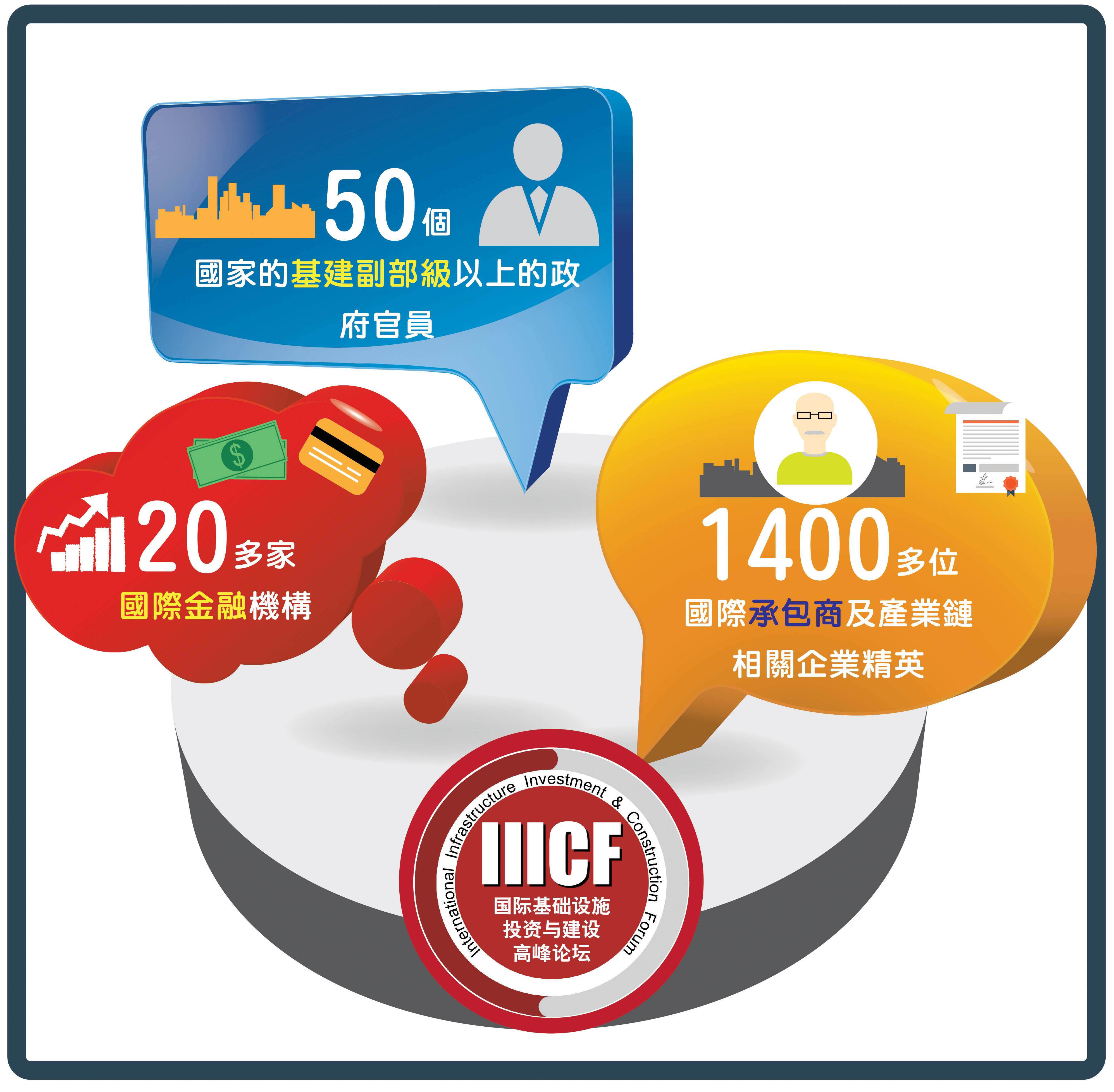 第七屆高峰論壇以“創新產融合作 助力基礎設施發展”為主題,關注國際基建合作中的投融資問題。近50位基建副部級以上的政府官員、20多家國際金融機構、1400多位國際承包商及產業鏈相關企業精英匯聚一堂,針對普遍關注的熱點話題“產融結合”、“投融資模式創新”、“風險防範及管控”、“企業轉型升級”等進行深入研討。