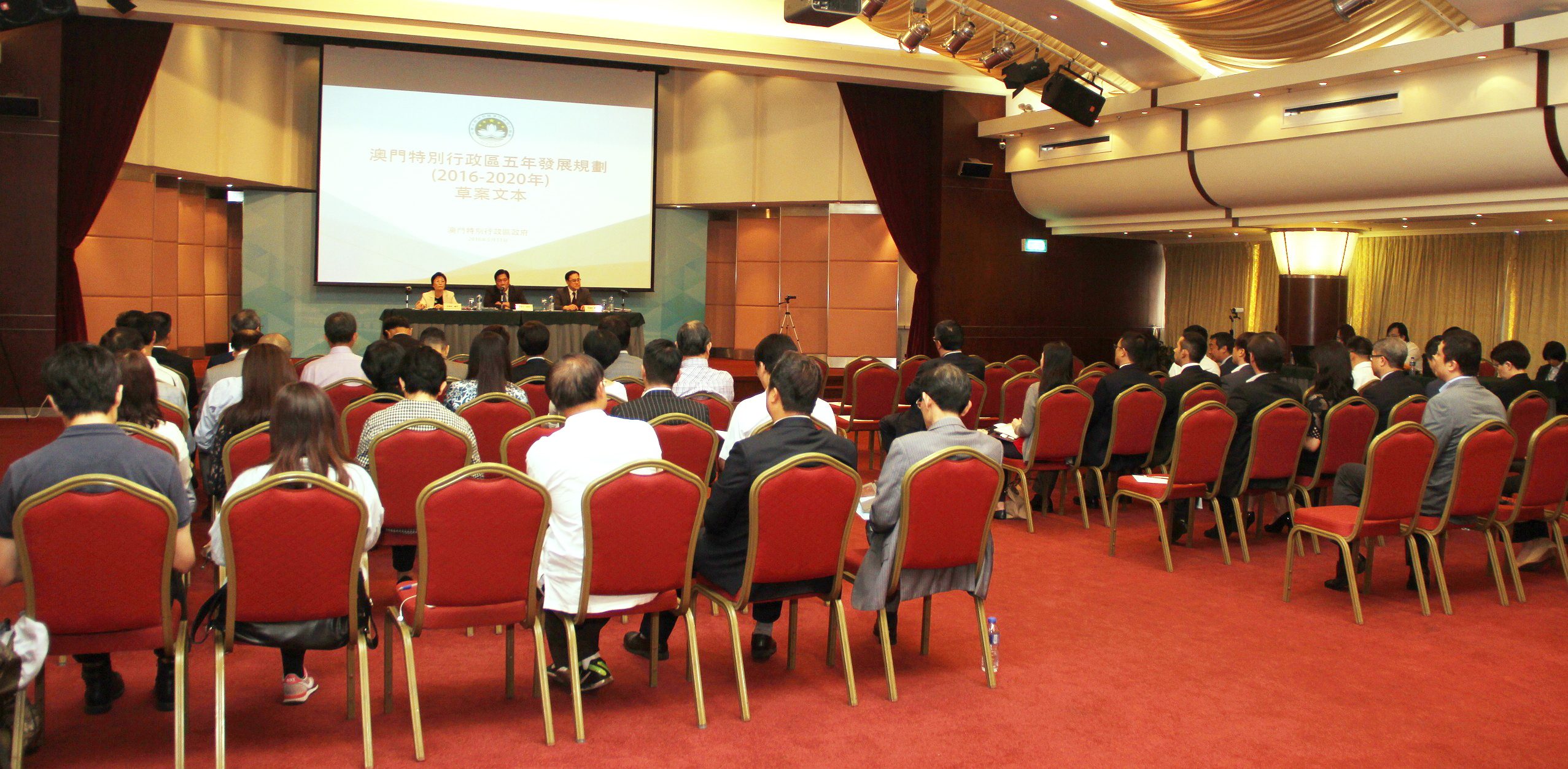 《澳門特別行政區五年發展規劃(2016-2020年)草案文本》於4月26日公佈並展開為期兩個月的意見收集工作。專責本次工作的政策研究室今日(5月31日)於澳門世界貿易中心蓮花廳舉行了兩場社會文化範疇及直屬行政長官的諮詢組織專場意見收集會。政策研究室主任劉本立、行政長官辦公室顧問李雁玲及政策研究室副主任吳海恩出席了意見收集會,並聽取了與會人士的意見。