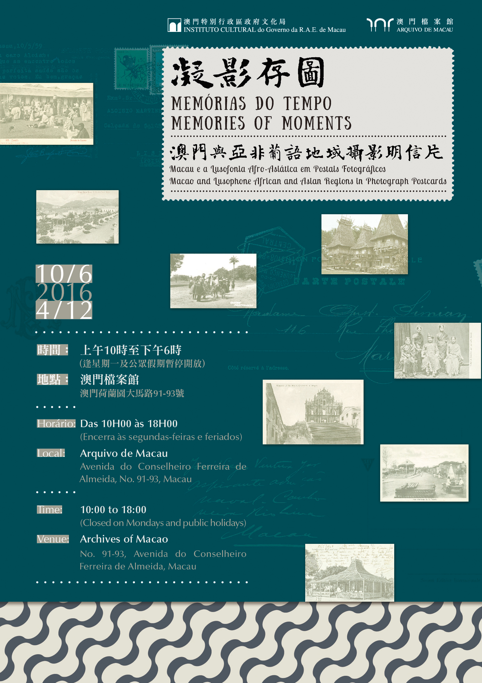為慶祝“中國文化遺產日”及“國際檔案日”,文化局轄下澳門檔案館將於六月八日下午六時三十分在塔石廣場澳門檔案館舉行“凝影存圖──澳門與亞非葡語地域攝影明信片”展覽開幕式,展期為六月十日至十二月四日。展覽期間亦會舉辦多場專題講座,首場講座將設於六月十五日下午六時三十分,歡迎市民參與。