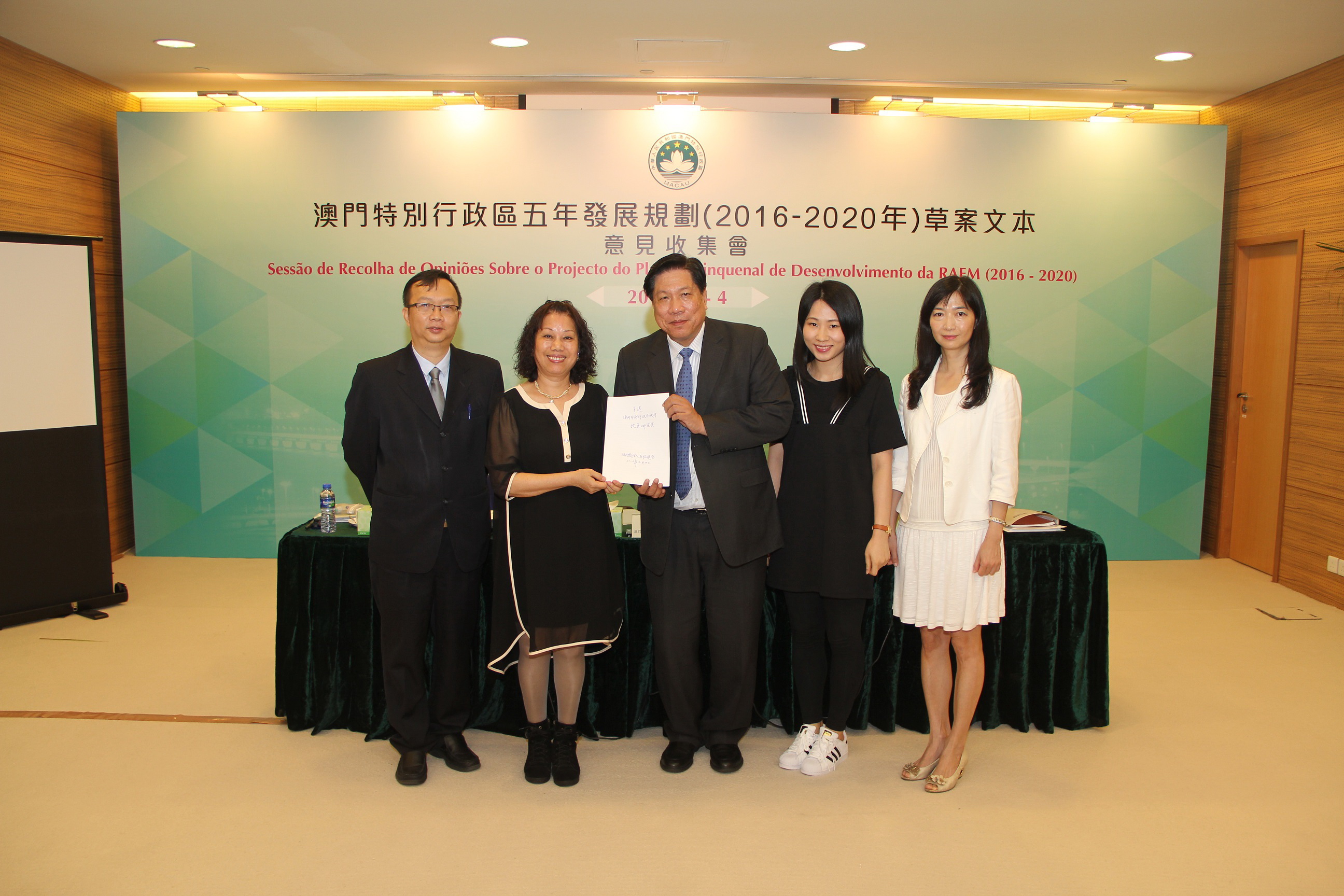 《澳門特區五年發展規劃(2016-2020年)草案文本》於4月26日公佈並展開為期兩個月的意見收集工作。五年發展規劃是未來五年特區經濟社會發展的總體藍圖,是政府與廣大居民共同努力的行動綱領。在編制過程中,得到國家發展和改革委員會規劃司、清華大學和澳門理工學院幾個顧問團隊的義務指導。