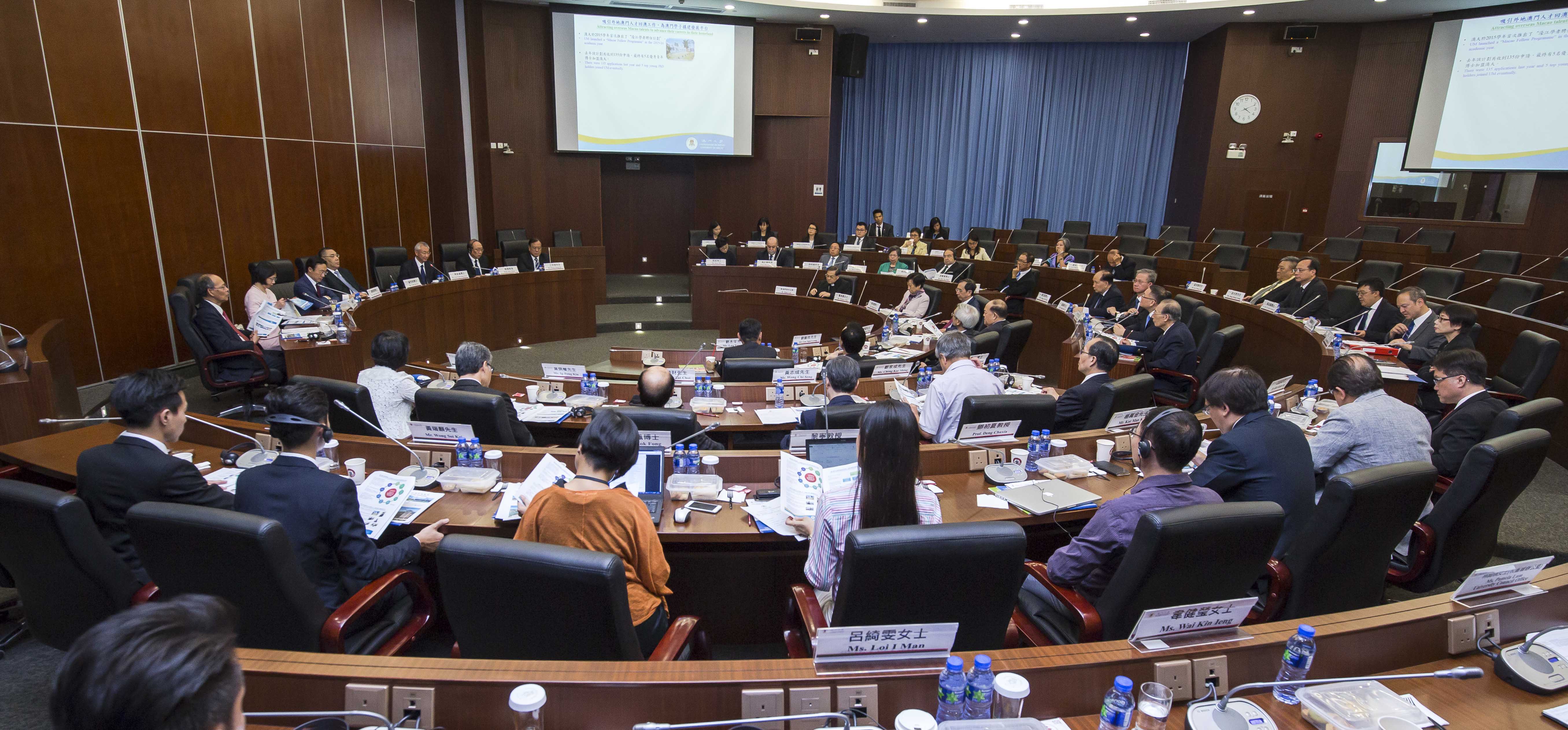 澳門大學2015/2016學年大學議庭及校董會聯席會議昨日(16日)於澳大何賢會議廳舉行,並由澳門特別行政區行政長官、澳大校監兼大學議庭主席崔世安主持。崔世安表示,澳大作為澳門的主要公立大學,在培育及引進人才的工作上責任重大,希望澳大能善用其優勢,加大力度吸引身在海外的澳門人才回流為澳大和澳門服務。