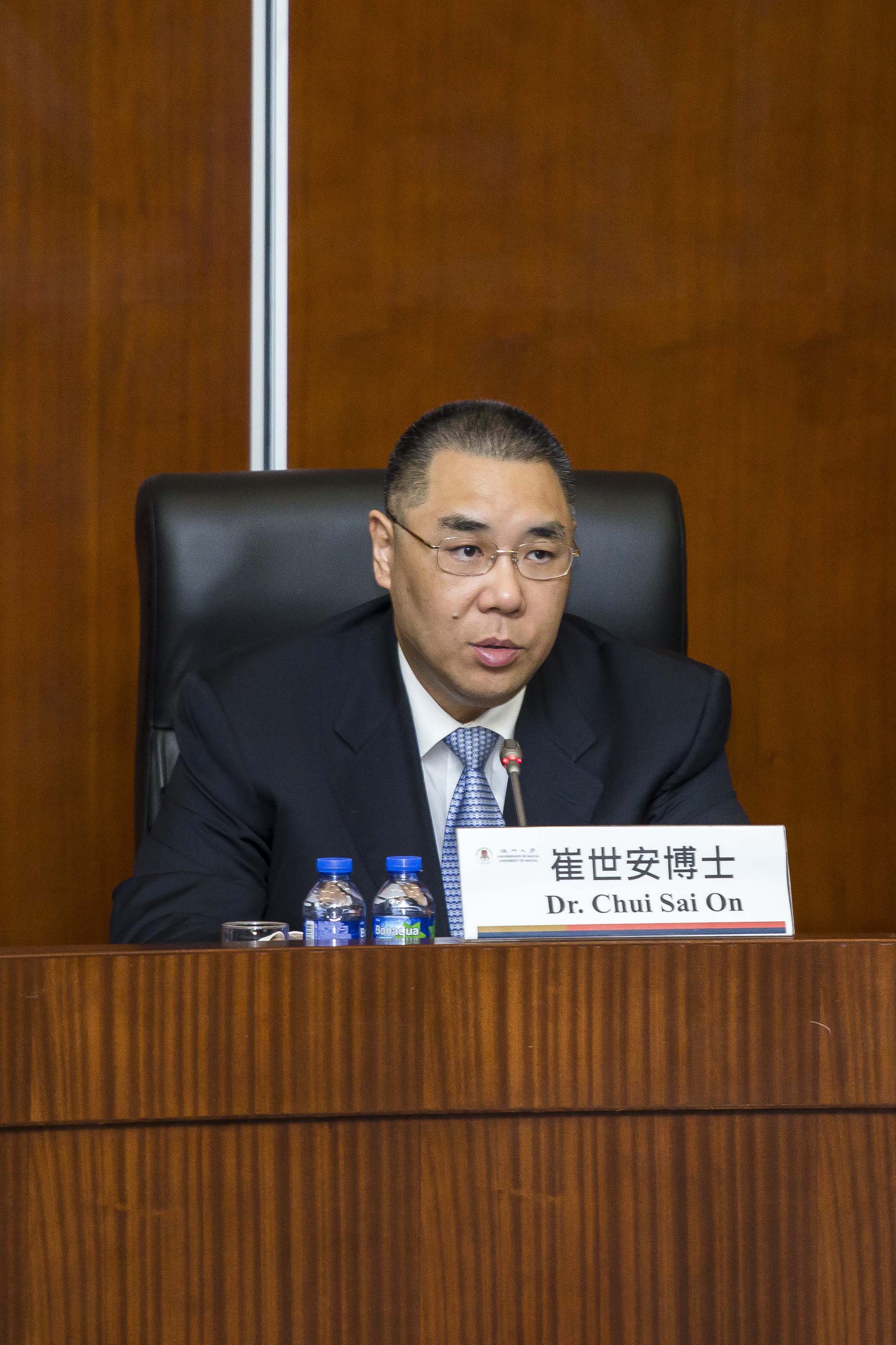 會上,崔世安首先感謝大學議庭及校董會成員過去一年為推動澳大發展所做出的的貢獻。他表示,澳大近年在學術和研究領域的不斷進步,已有相當的影響力和關注度,加上在硬件和軟件建設兩方面都得到很大的提升,希望澳大能善用其優勢,加大力度吸引身在海外的澳門人才回流為澳大、為澳門服務,以配合特區政府在人才引進方面的相關政策。他並冀望澳大在35 週年新的起點上,開拓創新,繼續加強與本地社區的溝通和互動,積極配合特區政府要加速建設成為“一個中心"、“一個平台"的目標,穩步發展,使大學的整體發展能有效地提升澳門高等教育的國際競爭力,以及緊貼澳門特區未來發展對各類人才的需求。