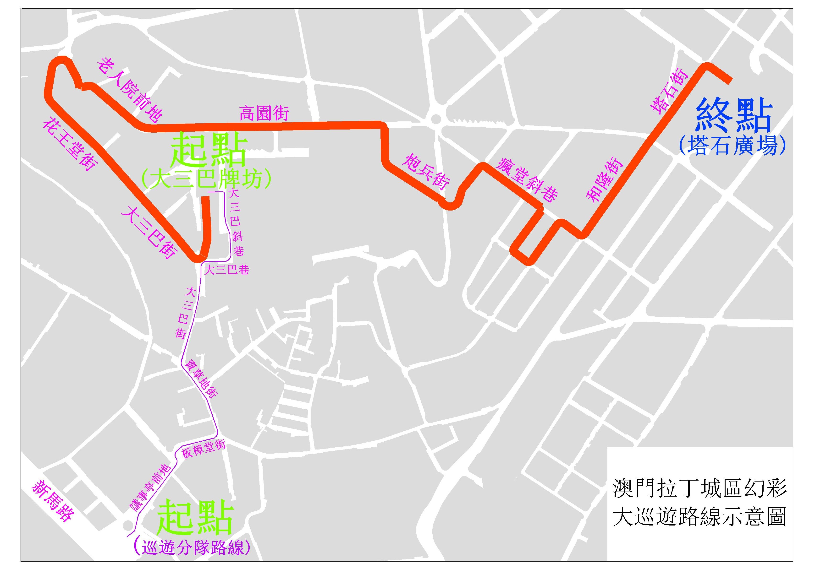 是次活動之巡遊路線分為兩段,其中巡遊分隊由議事亭前地出發,途經板樟堂前地、板樟堂街、賣草地街、大三巴街、大三巴巷、大三巴斜巷到達耶穌會紀念廣場;而主路線則由大三巴街出發,途經花王堂街、花王堂前地、老人院前地、高園街、炮兵街、美珊枝街、瘋堂斜巷、聖祿杞街、瘋堂中斜巷、瘋堂斜巷、和隆街和塔石街,最後到達塔石廣場舉行匯演。