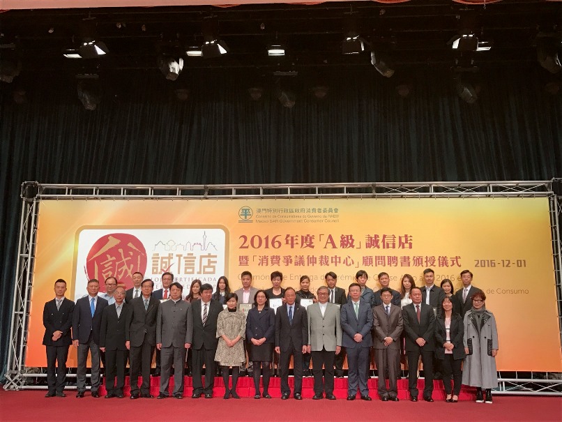 消委會舉行2016年度A級“誠信店”暨“消費爭議仲裁中心”顧問聘書頒授儀式,該會向12間A級“誠信店”頒發獎座予以表揚,並向逾千間“加盟商號”發出2017年度的“誠信店”標誌。