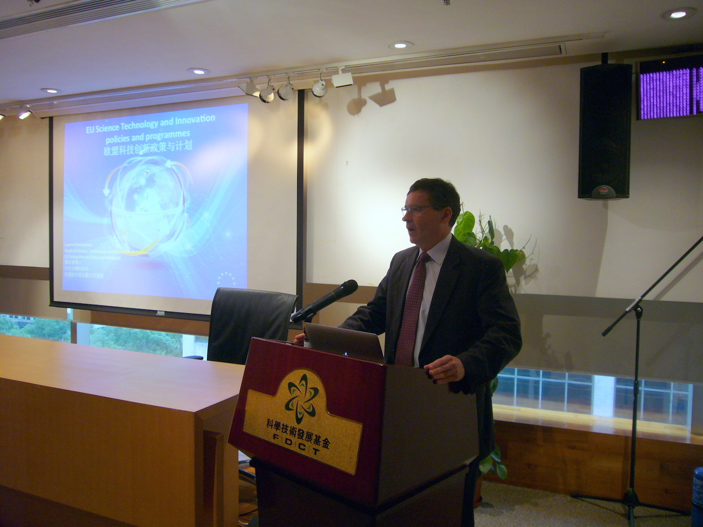薄思睿參贊表示“地平線2020計劃”是歐盟有史以來規模最大的研發創新計劃,擬在7年時間(2014-2020年)內投資近800億歐元,面向全世界開放,也面向澳門的科研人員和單位開放,希望澳門的科研人員能與歐盟的同行展開合作,共同申請。澳門團隊在參與過程中遇到任何疑問和困難,歐盟駐京和駐港澳的相關部門都會全力提供協助。Frederic Bretar先生介紹了法國參與“地平線2020計劃”的情況,並表示歡迎澳門與法國加強科技方面的交流和合作。