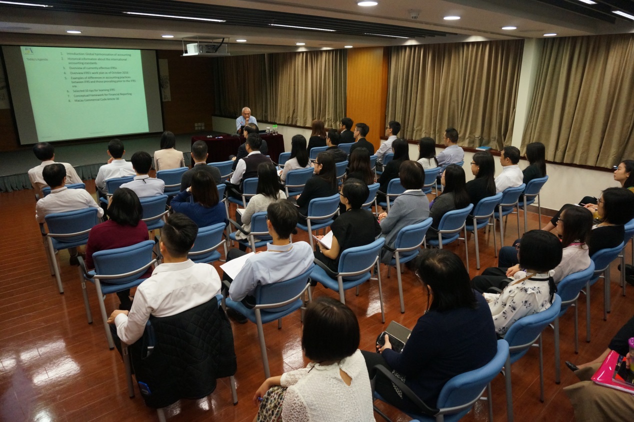 為應對審計工作需要,強化審計人員對國際專業規則的操作和認識,審計署特邀澳門註冊核數師,前羅兵咸永道會計師事務所合夥人馮志威先生,於本年11月14日及12月2日在審計署分別舉行兩場關於《國際財務報告準則》的專業培訓講座,參與2日課程的審計署相關人員逾100人次。