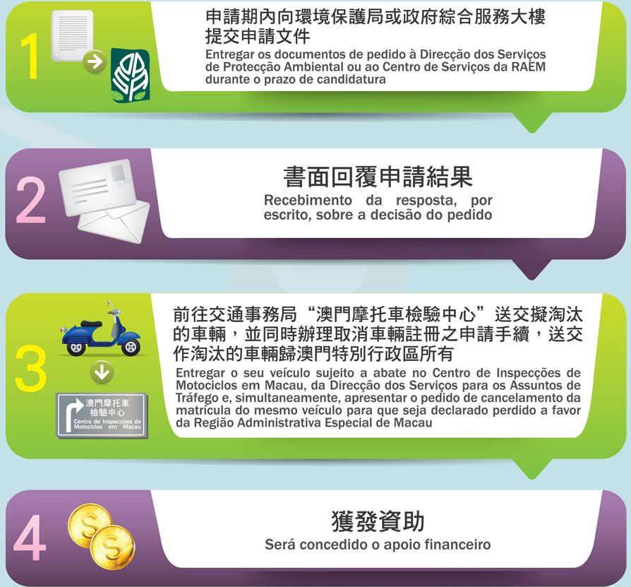 按照第3/2017號運輸工務司司長批示,資助計劃自2017年2月15日至6月30日期間接受申請。具體申請流程為以下四步驟:1. 合資格申請人向環境保護局(馬交石炮台馬路11號至11號D郵政大樓地下)或政府綜合服務大樓(黑沙環新街52號)提交申請文件;2.環保與節能基金會自申請資料交齊之日起計最快7個工作日、最長75日內就批給資助與否作出決定,以及將有關決定以書面方式通知申請人;3.申請人在接獲有關批給資助決定的通知後,須在環境保護局所定期間內將有關車輛送往交通事務局澳門摩托車檢驗中心作淘汰,並同時向交通事務局提交取消車輛註冊的申請,送交作淘汰的車輛歸澳門特別行政區所有;4.環保與節能基金在收到交通事務局通知已取消有關車輛註冊後60日內向申請人支付資助。每輛送交作淘汰的重型或輕型二衝程摩托車獲資助的金額為澳門幣3500元。