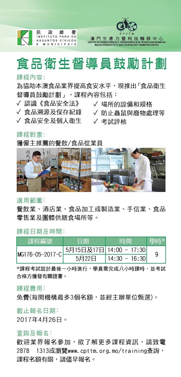 為協助本澳食品業界做好食品安全管理工作,民政總署委託澳門生產力暨科技轉移中心開辦“食品衛生督導員課程”,五月份課程將於五月十五日在澳門生產力暨科技轉移中心舉行。民署鼓勵僱主積極推薦員工報讀,為所屬公司及工作場所考取資格,提升從業人員的食安水平。課程截止報名日期為四月二十六日。