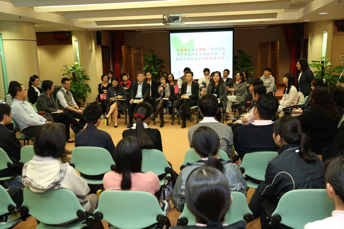 座談會邀請了鄭觀應公立學校校長胡潔、粵華中學副校長黃建民及勞工子弟學校副主任林文富分享處理危機事件的經驗和心得,指出要解決危機事件,學校人員必須上下一心去面對、互相陪伴和支援,這樣才能真正體會到“以生命影響生命,以愛喚起愛”的力量,同時也鼓勵與會者除關心學生學業成績外,也需要瞭解每個學生的獨特情況,避免不幸事件發生。