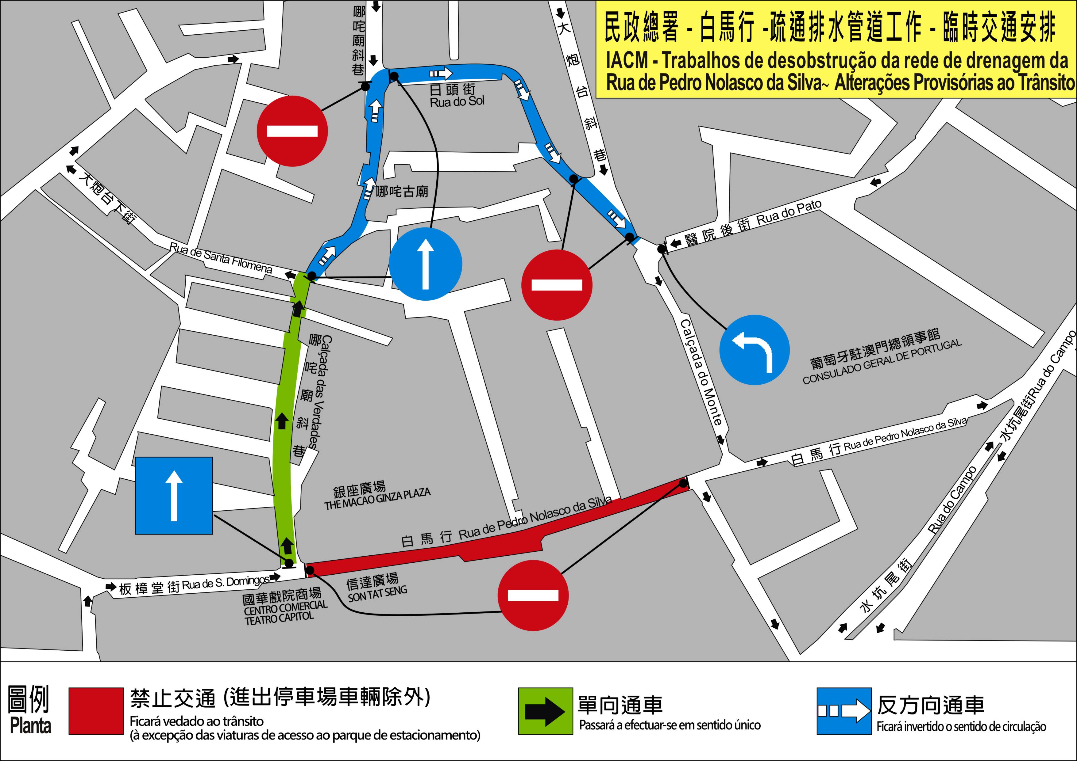 因疏通排水管道,4月22日(周六)及23日(周日)每日凌晨1時至5時,介乎哪咤廟斜巷與素鴉利神父巷之間的一段白馬行臨時封閉交通(進出停車場車輛除外);介乎板樟堂街與大炮台下街之間的一段哪咤廟斜巷實施單向通車(由板樟堂街往大炮台下街方向),介乎大炮台下街與日頭街之間的一段哪咤廟斜巷(由大炮台下街往日頭街方向)及日頭街(由哪咤廟斜巷往大炮台斜巷方向)則實施反方向通車。