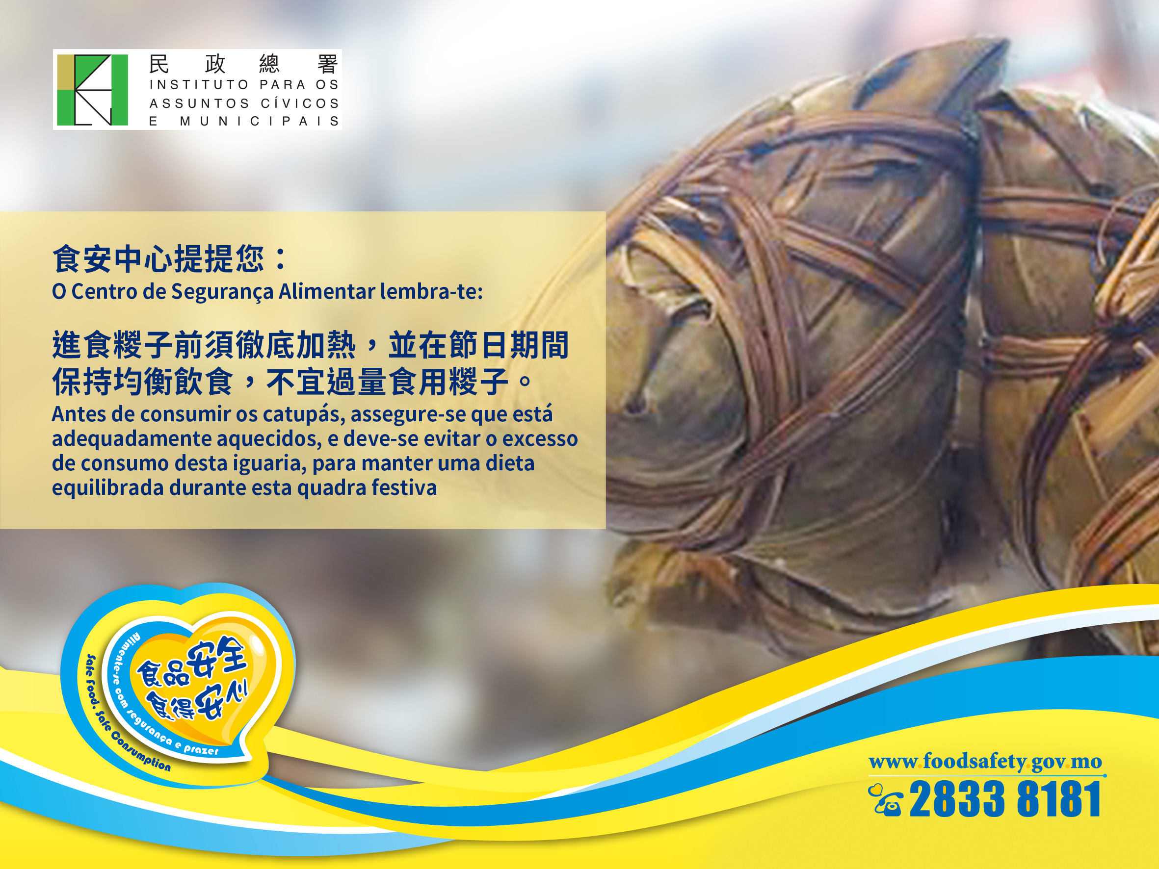 最後,市民應保持均衡飲食,糉子的熱量和脂肪含量都偏高,不宜過量食用。有關本年度端午食品整體檢測結果的詳情,可瀏覽食品安全資訊網www.foodsafety.gov.mo。