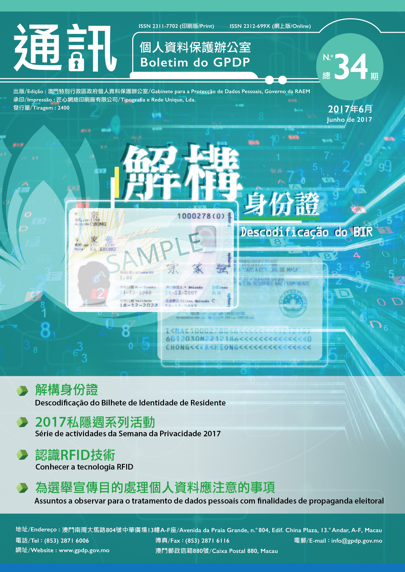 個人資料保護辦公室最新出版的第34期《通訊》,以跟大眾有切身關係的身份證為題材,詳細介紹現時採用的智能身份證內所包含的個人資料,以及資料存取功能和操作原理,讓大眾對自己的身份證有更進一步的了解,從而明白妥善保存和處理身份證及相關資料的重要性。