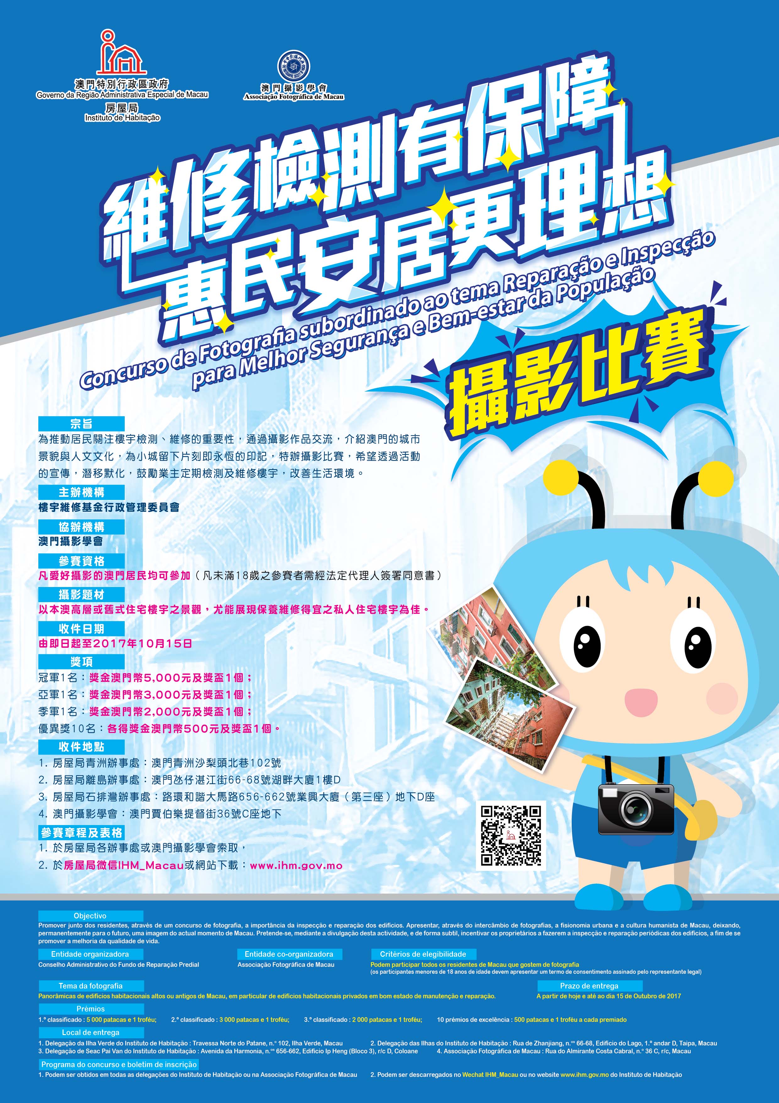 為持續推廣樓宇檢測與維修的重要性,樓宇維修基金行政管理委員會以「維修檢測有保障 惠民安居更理想」為題舉辦攝影比賽,並由澳門攝影學會協辦,比賽截止日期為今年10月15日,旨在透過各參賽作品呈現本澳城市與樓宇的各種面貌,讓業主愛惜自己的居所,從而提升樓宇保養的意識。