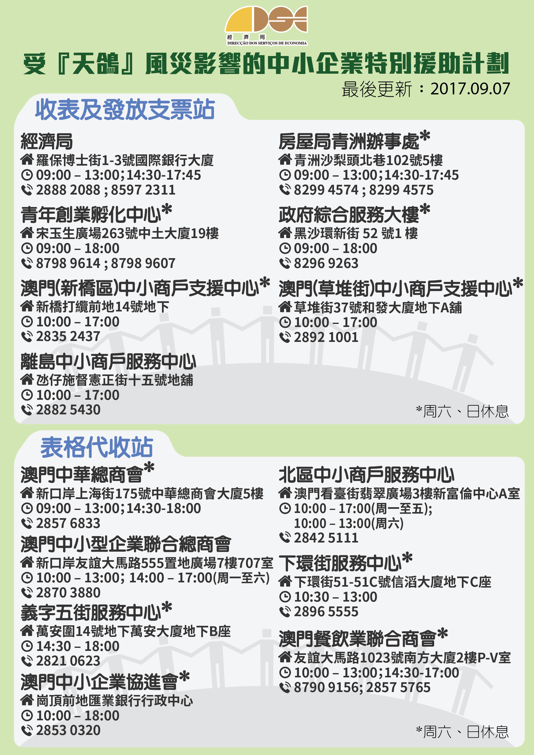 為便利受災中小商戶提交兩項援助措施申請,經濟局、離島收表站於本周六日(9月9、10日) 將繼續開放,而北區以及皇朝區的代收站亦會於本周六(9月9日) 開放,地址及辦公時間詳見附圖。