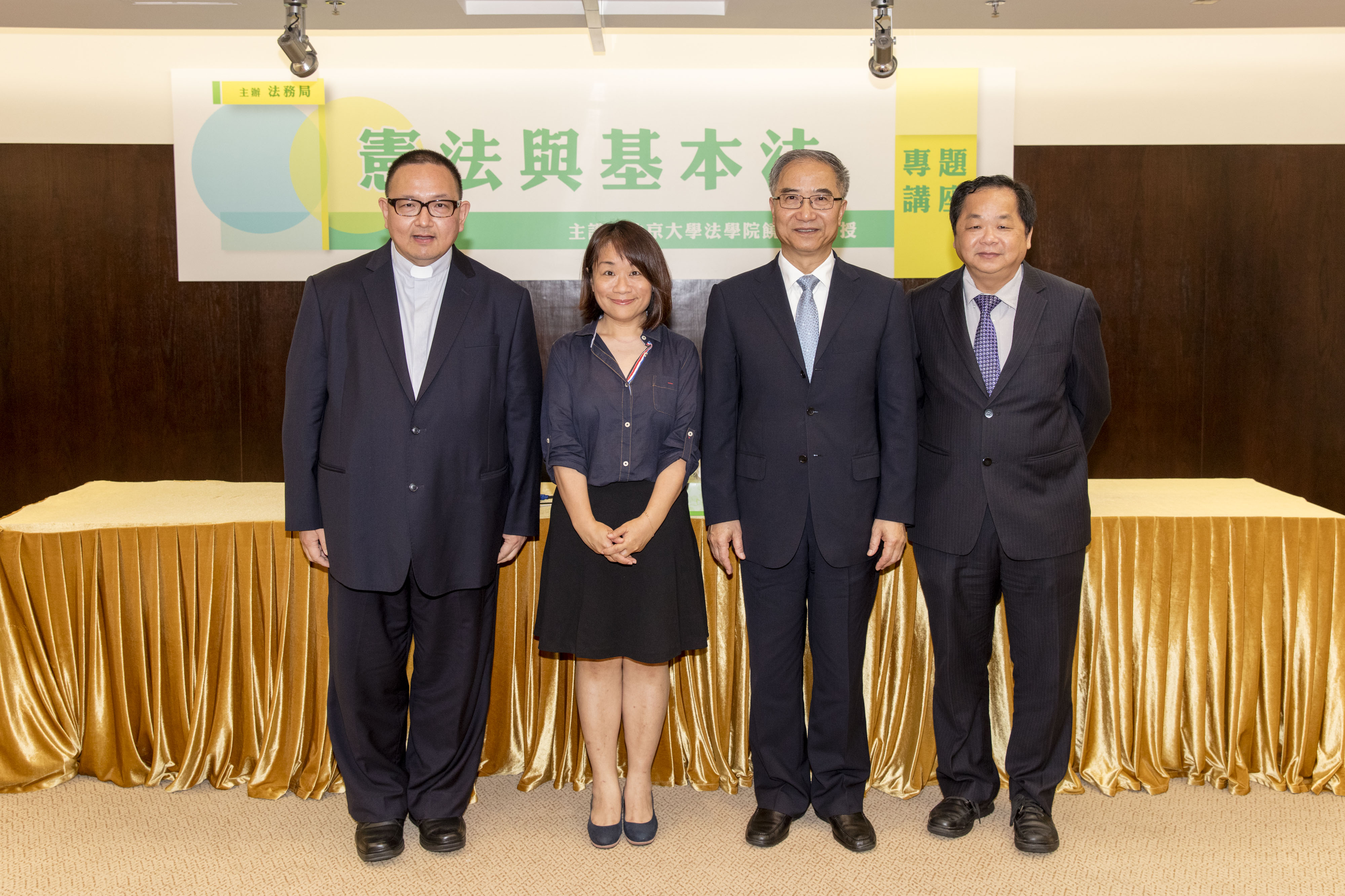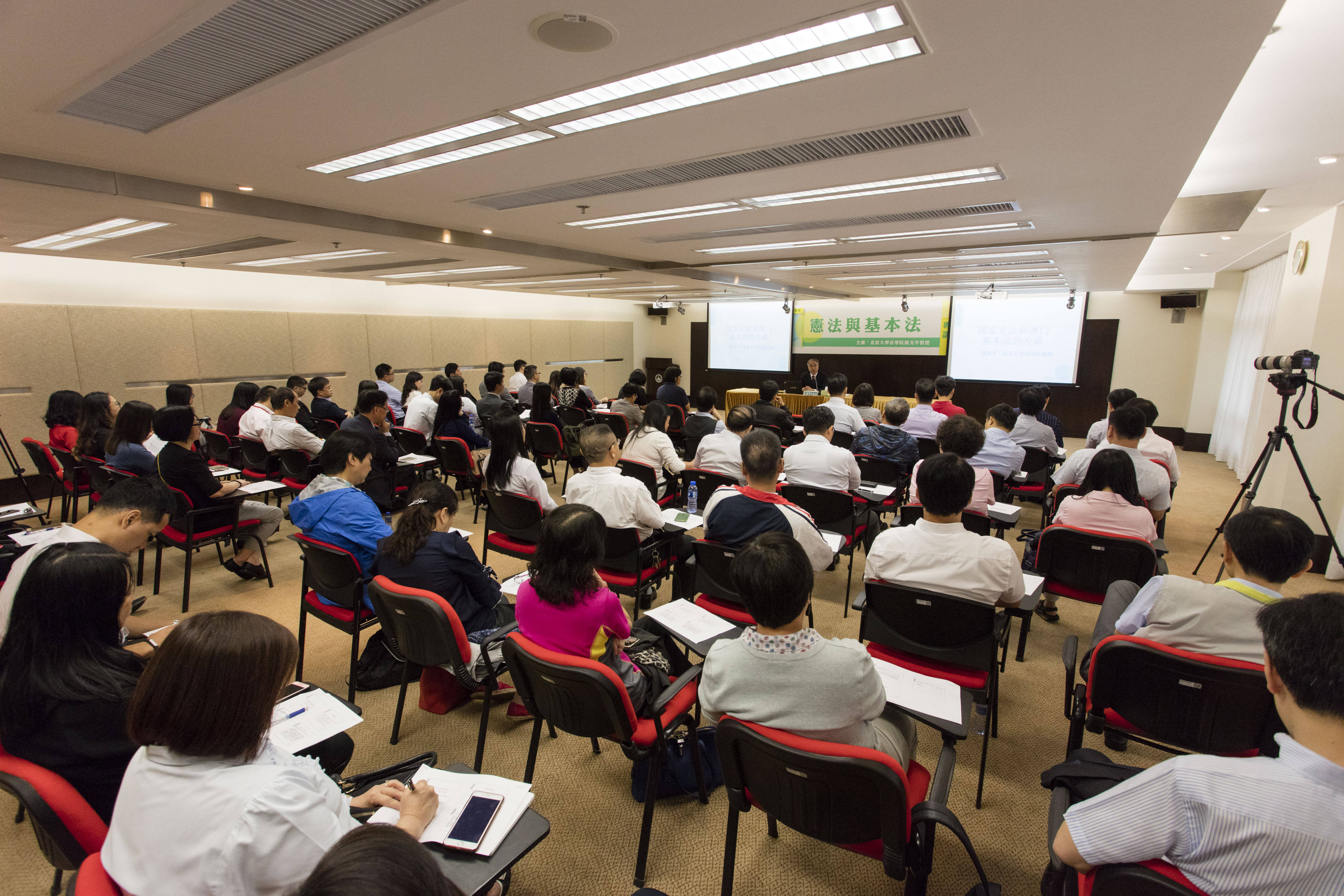 由法務局主辦的“憲法與基本法專題講座”,分別獲中華教育會及天主教學校聯會協助,合共舉辦了三場,有超過三百二十位中小學校長、主任及老師出席。饒戈平教授主要就國家《憲法》與《基本法》的關係作出了詳細講解,並在講座中提到了幾點問題,包括:《憲法》是什麼?國家《憲法》在“一國兩制”下的澳門特別行政區處於什麼法律地位?澳門有沒有尊重、遵守和維護《憲法》的義務?以及強調《憲法》在澳門適用的重要性等內容。饒教授指出:「澳門回歸十八年以來,從政府到學校以至社會各界,均非常重視《基本法》的推廣和教育,這是澳門能全面準確貫徹“一國兩制”,取得重大發展的關鍵因素。從現在看,應加強《憲法》的教育及傳播工作,包括樹立堅定的國家意識。“一國兩制”的深入實施,從法律上來說,就是樹立國家《憲法》觀念。」同時,他亦強調:「《憲法》不單單是《基本法》產生的依據和基礎,《憲法》同時與《基本法》一起構成了澳門的憲制性法律,《基本法》體現了《憲法》的一些內容,但不能取代《憲法》的作用,《憲法》是國家的根本法,凌駕於所有全國性法律之上,包括《基本法》。」最後他補充說:「期望澳門的教育工作者,能認識這些內容的重要性,在學校的通識教育和國民教育中加強國家《憲法》的教育,包括運用活潑的形式,把《憲法》的基本內容,主要的框架結構,以及《憲法》與《基本法》的關係等加入教材中。」出席的教育工作者在講座中提出了不同的問題作討論,包括在日常教學中,如何向學生講解“愛國愛澳”精神,以至習主席於十九大報告期間提及有關澳門的內容等,饒教授都作出了詳細回應。