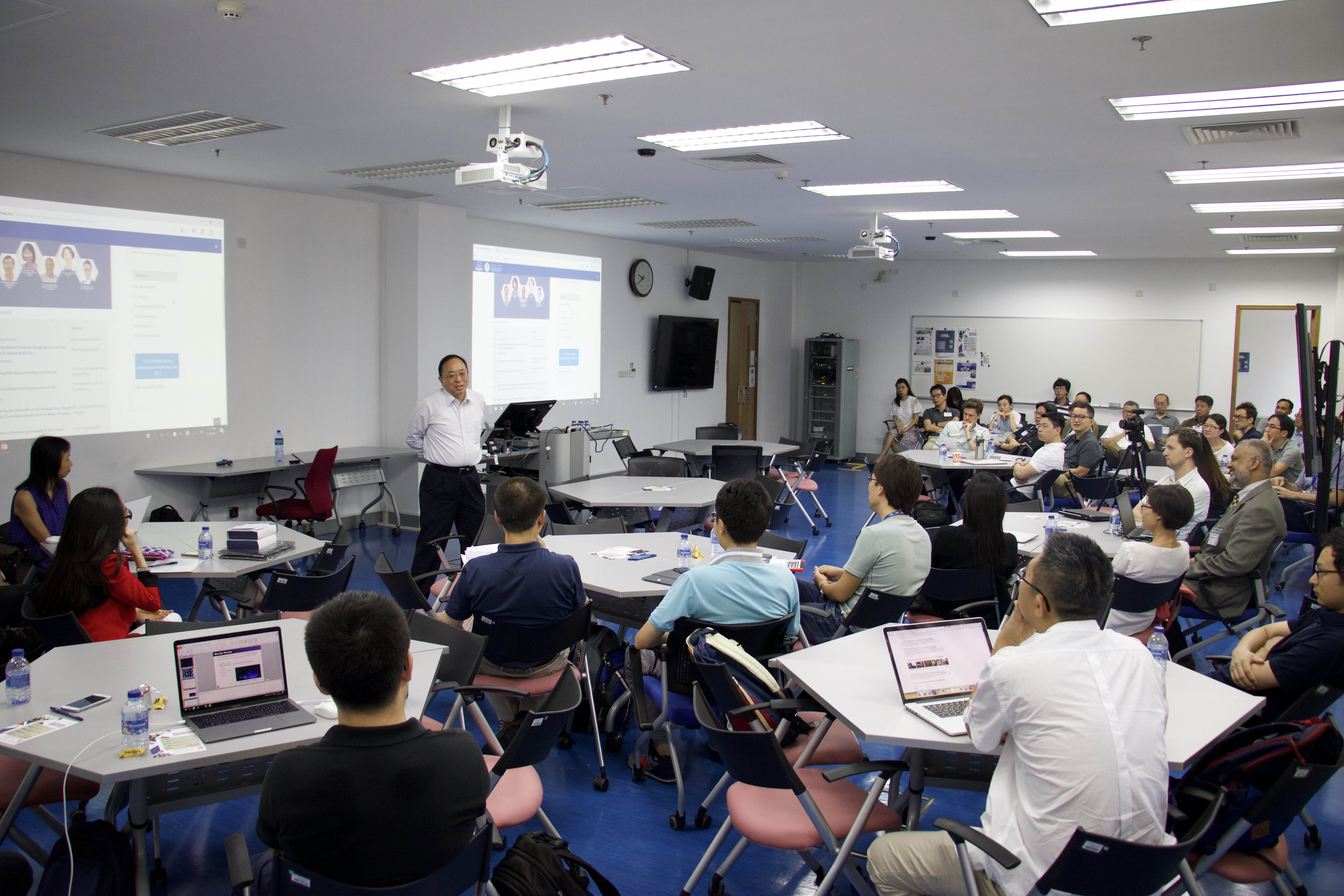 CTLE主任王嘉祺認為,在大型課堂上追蹤學生學習進度,滿足學習需求是一大挑戰。她分享過去的教學經驗,如使用Poll Everywhere(提供即時反饋的網上教學工具)檢查學生對課堂的理解情況、使用六角桌椅方便師生互動或進行同儕教學等。王嘉祺解釋,同儕學習要求學生向同學解釋某一概念的同時,給予具行動性的評估方法,如設置問題測試、分配簡單任務等。這些練習簡短且目標明確,學生大都可在幾分鐘內完成,同時老師也可評估學生學習進度。