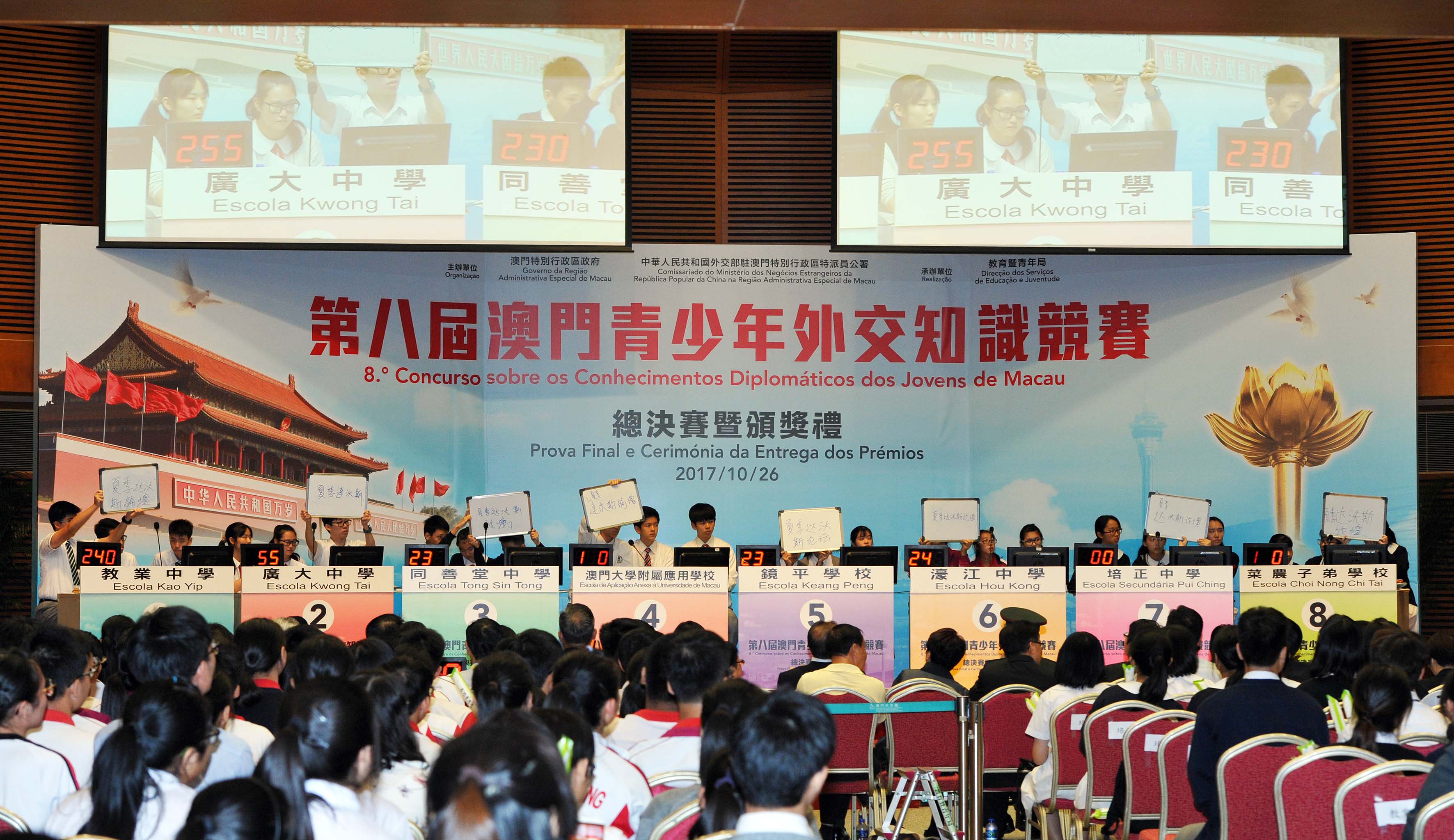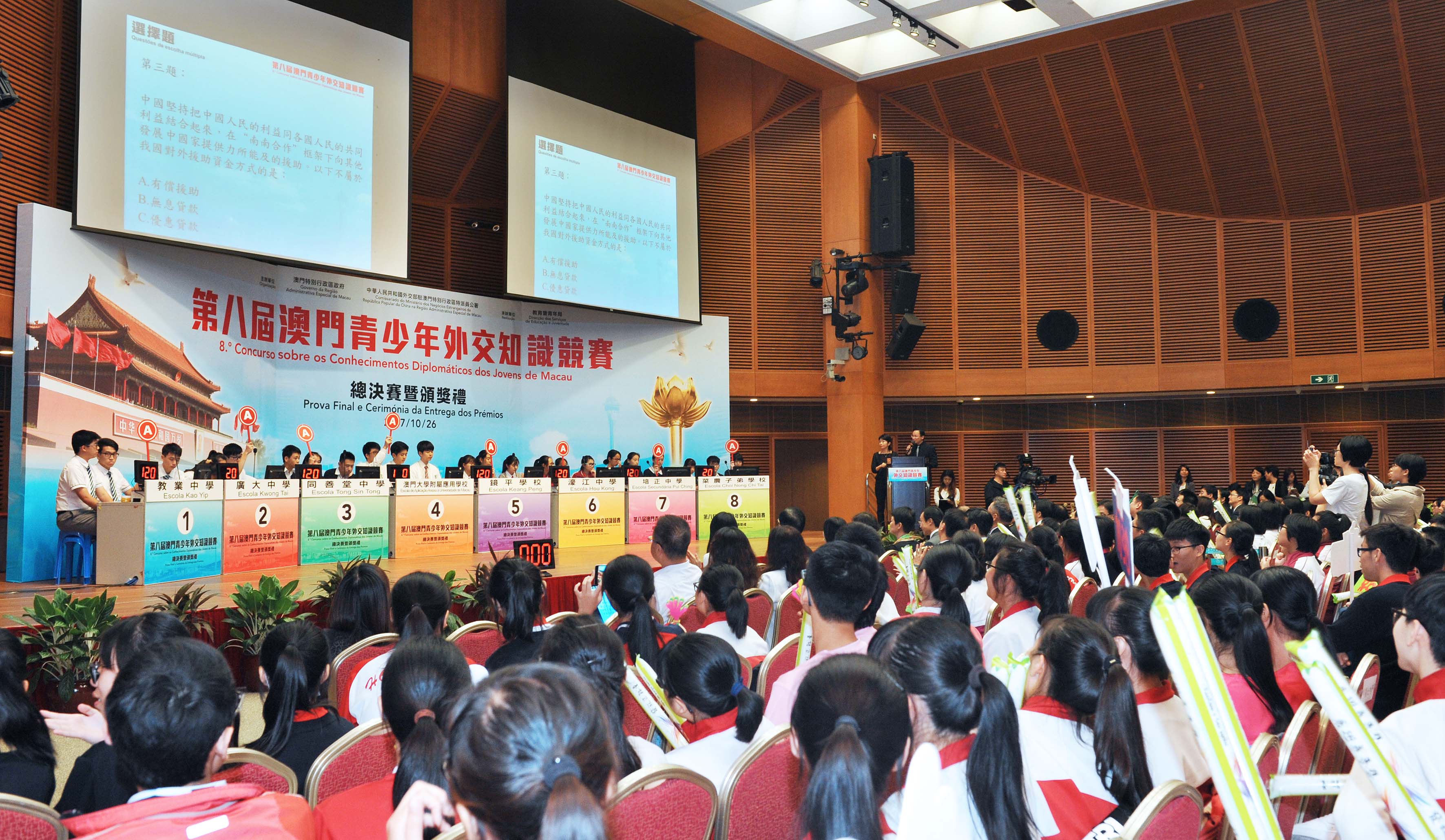 第八屆“澳門青少年外交知識競賽”報名情況踴躍,共吸引了30間學校派出150名學生組隊參加。經過9月23日的初賽,8支隊伍成功進入總決賽。10月26日總決賽當天,除參賽隊伍外,現場更有400多名學校的領導、師生出席支持,為參賽同學打氣,氣氛熱烈。比賽設4個環節,包括選擇題、填充題、搶答題和情景題,內容圍繞《中國外交知識讀本》、國家外交政策、「一帶一路」國家發展戰略及國際形勢和新聞時事等,以擴闊學生的知識面。在現場師生們此起彼落的吶喊助威聲中,各參賽隊伍均越戰越勇,學生們精彩的表現獲得現場評審及觀眾的一致好評,令人印象深刻。經過激烈的角逐,最終結果是,廣大中學、濠江中學、教業中學及同善堂中學依次奪得冠、亞、季及殿軍。獲得優異獎的學校包括培正中學、鏡平學校、澳門大學附屬應用學校及菜農子弟學校。