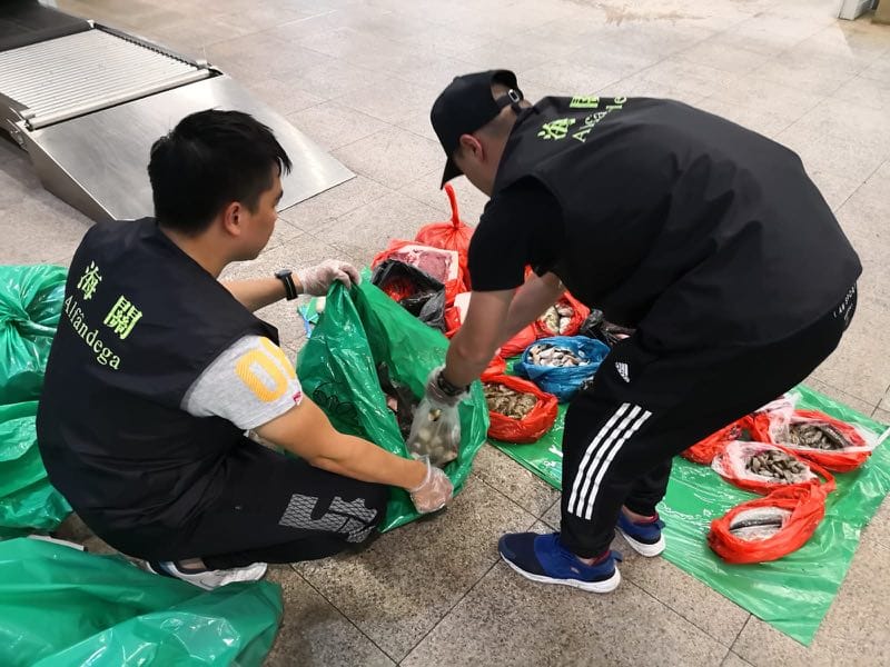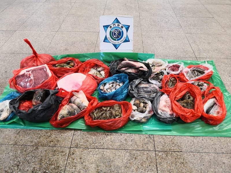 為堵截未經檢疫肉類進入澳門,海關一連兩日展開特別部署,打擊攜帶未經檢疫的食材進入本澳的違法行為。行動中共對45名可疑人士進行檢查及跟蹤調查,成功查獲13宗違規個案,涉及未經檢疫食材約94公斤,包括豬肉26.5公斤、已宰家禽16.8公斤、魚乾5.8公斤、魚類18.1公斤、蠔仔肉7公斤、雞內臟0.5公斤、豬紅5.3公斤、牛肉1公斤、熟肉5.9公斤、海產及貝殼類7.9公斤,已移交民政總署處理。