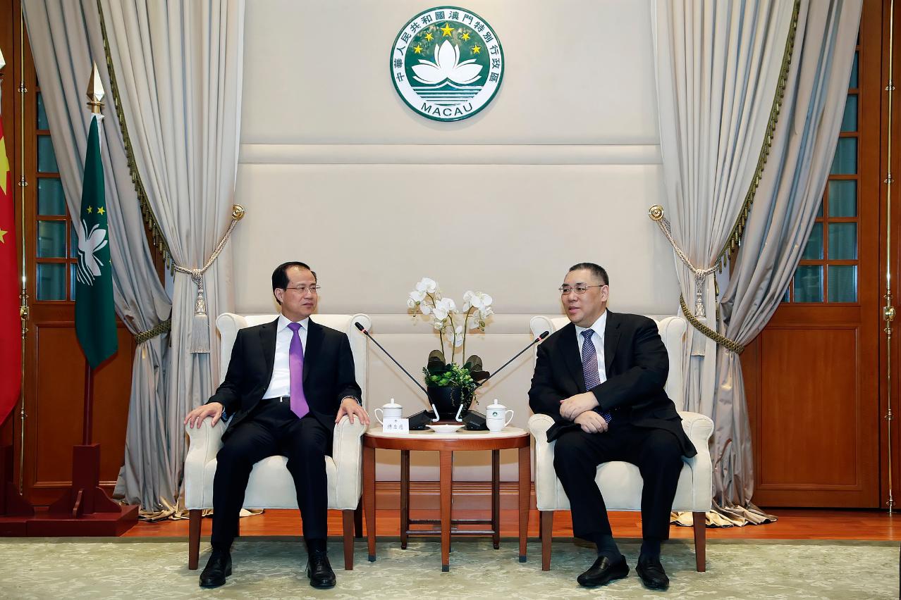 行政長官崔世安今(7)日上午在政府總部會見來澳履新的中央人民政府駐澳門特別行政區聯絡辦公室主任傅自應,雙方將繼續保持良好溝通和合作,為“一國兩制”在澳門的成功實踐和推動澳門長期繁榮穩定發展共同努力。