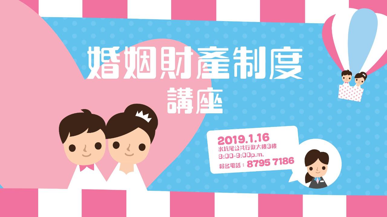 今年第一場“婚姻財產制度講座"將於1月16日(星期三)晚上8時至9時在水坑尾公共行政大樓三樓舉行,歡迎市民報名留座。報名或查詢可致電法務局8795 7186。