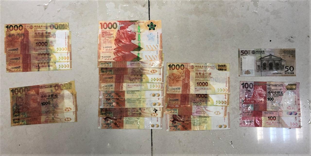 11日清晨,海關巡邏快艇在氹仔海洋花園單車徑對開海面巡邏期間發現一艘可疑機動木舢舨,成功將其截停進行搜查,在船上截獲一名懷疑蛇頭及兩名非法入境者,並在船艙內搜出23張紙幣(19張面值1,000元港幣、3張面值100元港幣及1張面值50元澳門幣),當中部分紙幣編號重覆,質料粗糙,懷疑為偽鈔,故海關已即時將事件通報司法警察局作跟進調查。