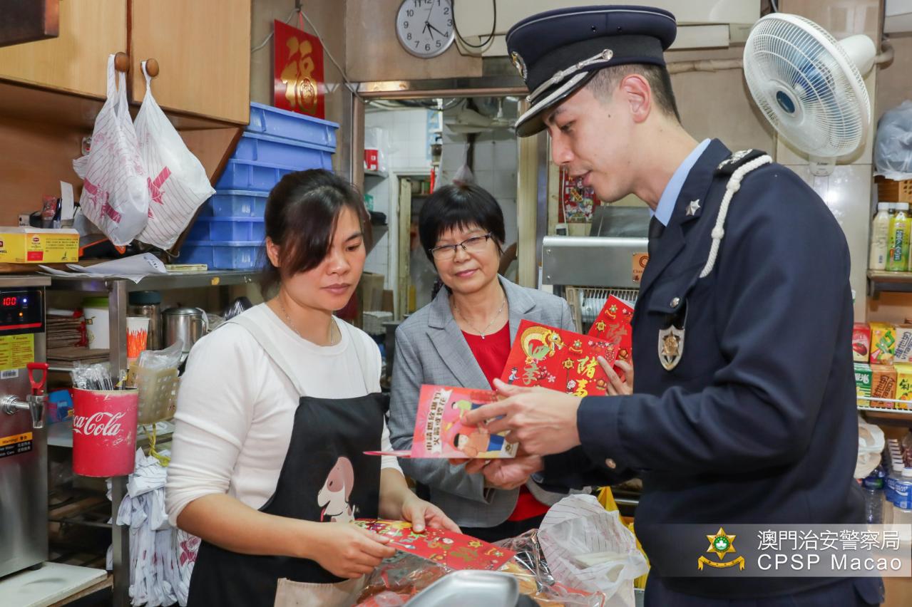 治安警察局人員聯同街坊總會北區辦事處代表向商戶進行冬防宣傳