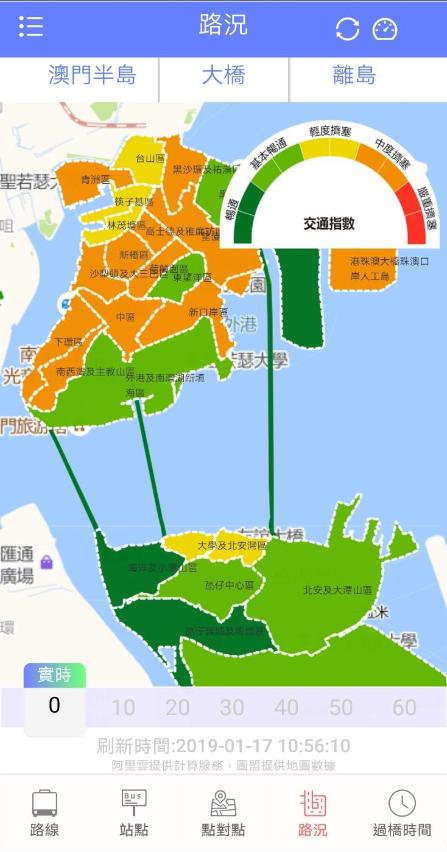 實時及預測交通路況功能包括兩個部份,一為分區實時及預測交通路況:用戶可查看各分區實時及預測未來1小時內的交通路況;二為道路實時及預測交通路況:用戶可查看全澳A級道路的實時及預測未來1小時內的交通路況,並由原本兩種分級優化至顯示五種分級,即暢通、基本暢通、輕度擠塞、中度擠塞及嚴重擠塞,方便市民了解道路交通情況。