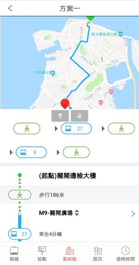 點對點查詢方面,新版本優點在於可利用多種不同的選點方式,包括透過手機定位所在位置、地圖選點、輸入關鍵字(如巴士站編號、巴士站名、地標、建築物名稱等)或於我的收藏及歷史輸入中揀選任意起點和終點,期後APP將提供不同出行方案供選擇,如乘車時間較短、步行較少、換乘較少、途經站較少及滿載率較低等,乘客可按不同的偏好挑選方案,出行建議中亦會包含預計巴士行程時間等,亦可利用地圖界面查看每一出行方案的步行距離,上車、途經及下車的巴士站點,此新版本點對點查詢功能待上線穩定後,將安排取代原有點對點查詢功能。另外,新版本提供乘客滿意度調查功能,乘客可就每一班車評價滿意度,以助局方優化巴士服務工作。