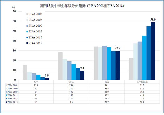 圖1:澳門15歲中學生就讀年級分佈趨勢 (PISA 2003 至 PISA 2018)