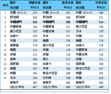 表1:PISA 2018閱讀、數學和科學素養排名前15個國家/經濟體平均成績