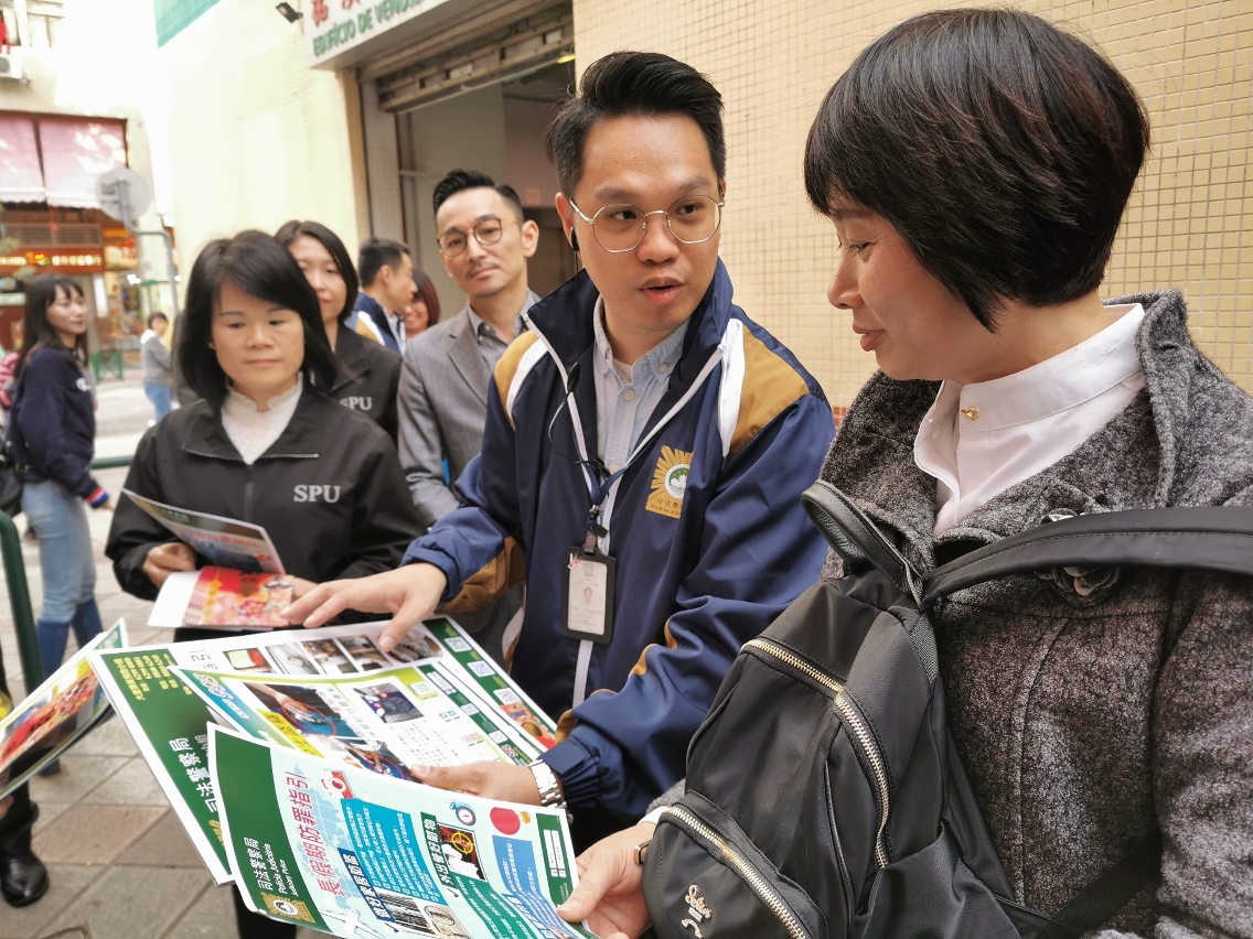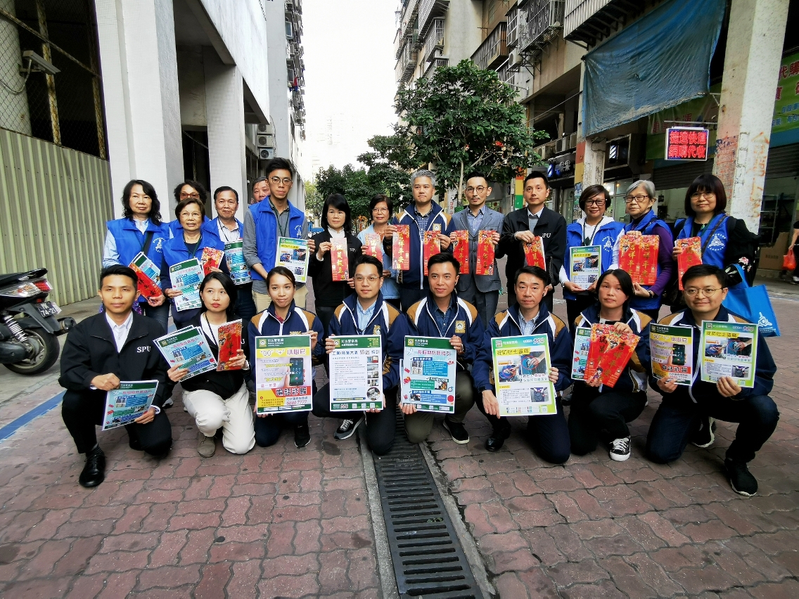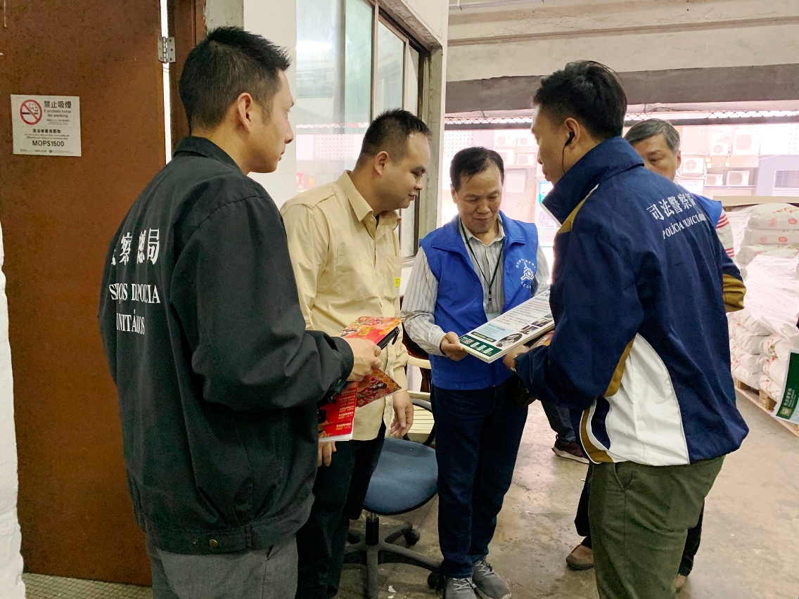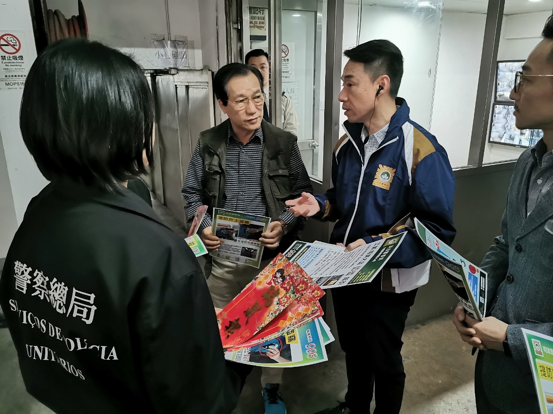 1月8日下午,司警局人員聯同警察總局、街區坊會和物業管理業商會代表,以及“司警局大廈防罪之友"會員率先於祐漢區內的住宅和工業大廈、休憩區、巴士站及商舖進行冬防宣傳,向居民、商戶及物業管理人員講解冬防資訊。