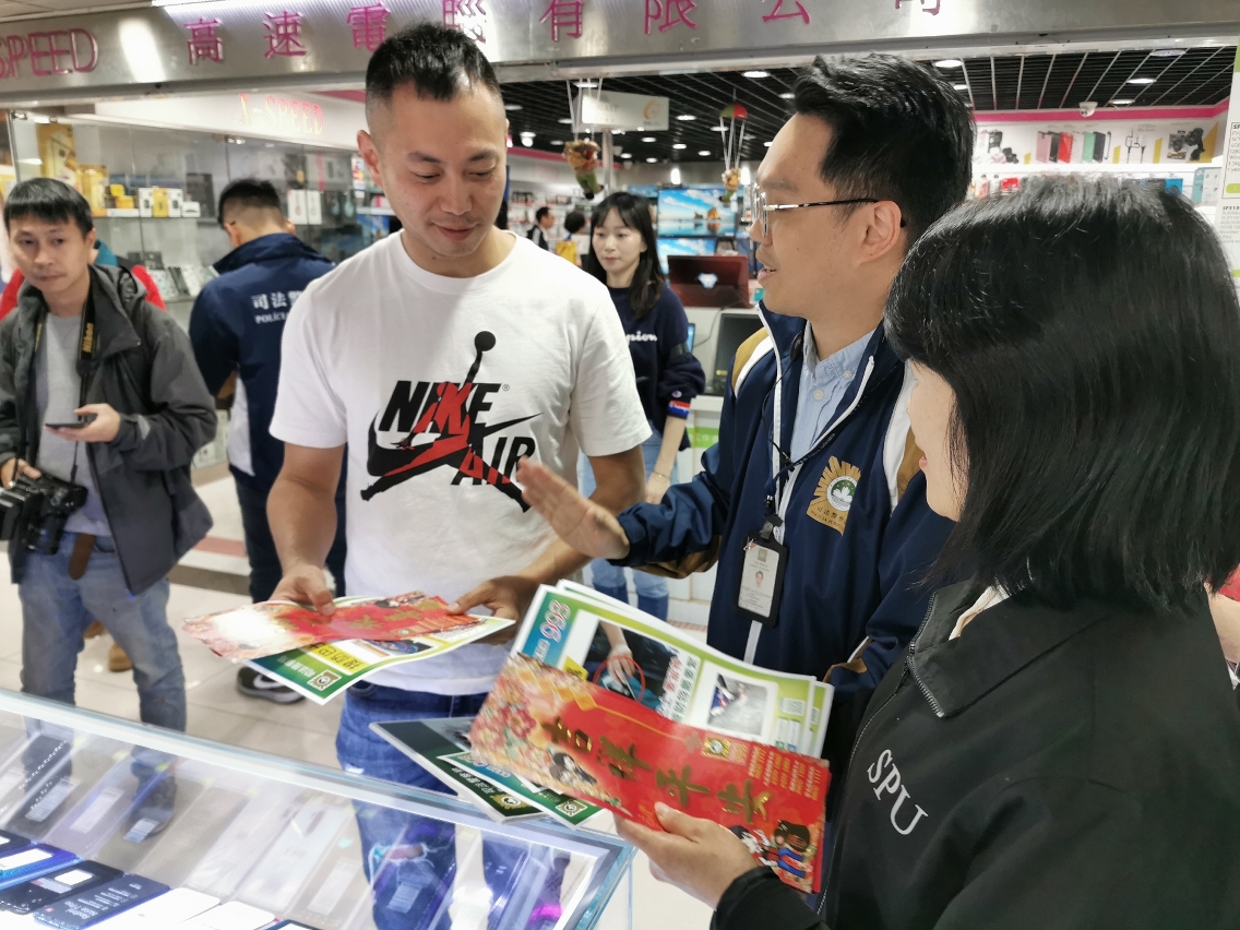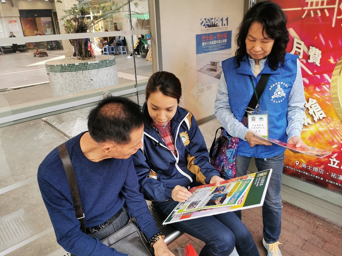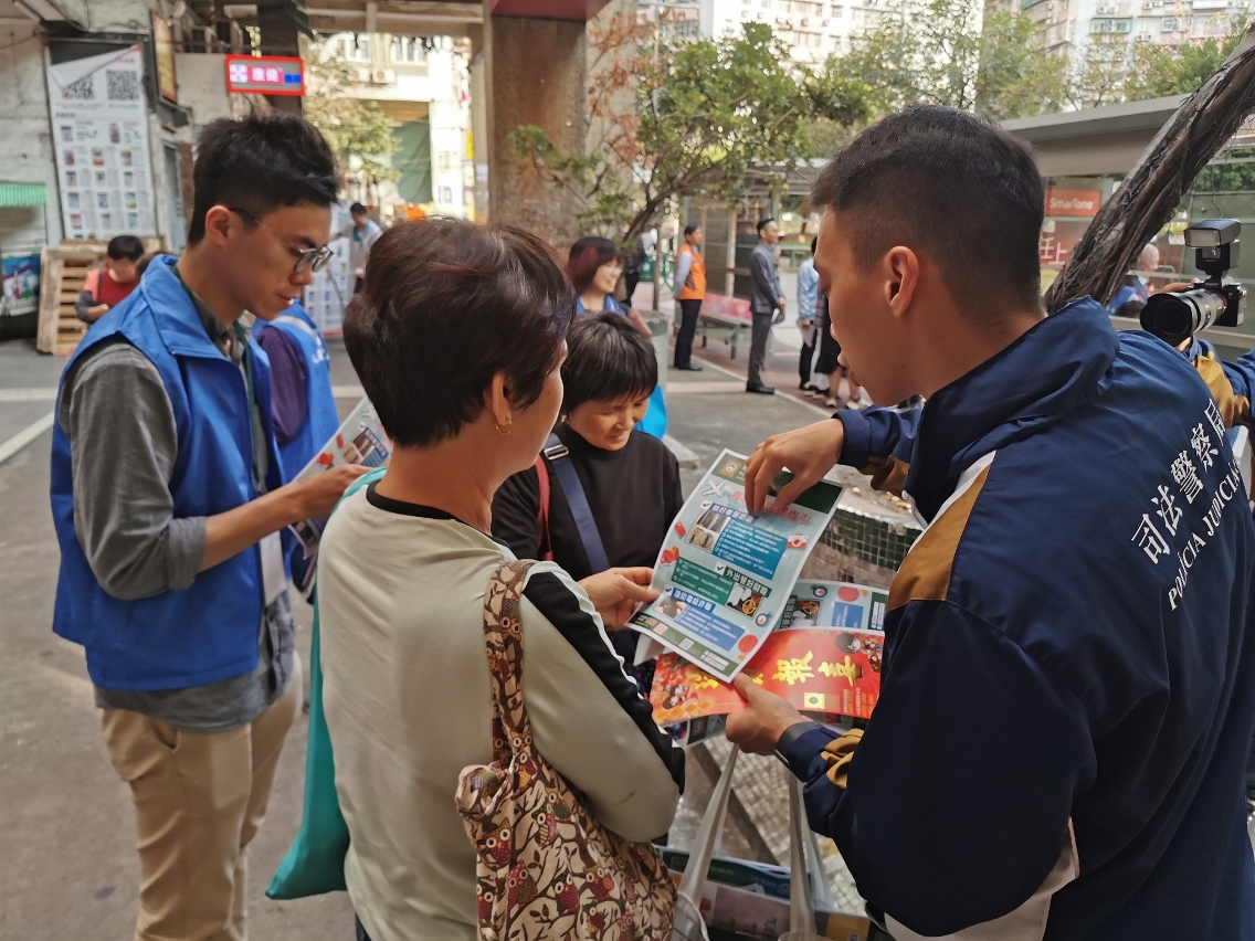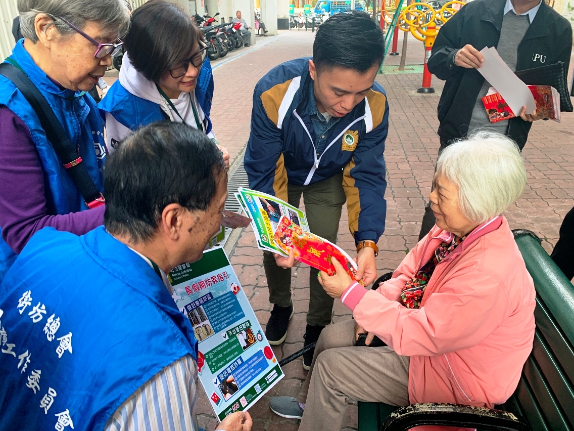 1月8日下午,司警局人員聯同警察總局、街區坊會和物業管理業商會代表,以及“司警局大廈防罪之友"會員率先於祐漢區內的住宅和工業大廈、休憩區、巴士站及商舖進行冬防宣傳,向居民、商戶及物業管理人員講解冬防資訊。