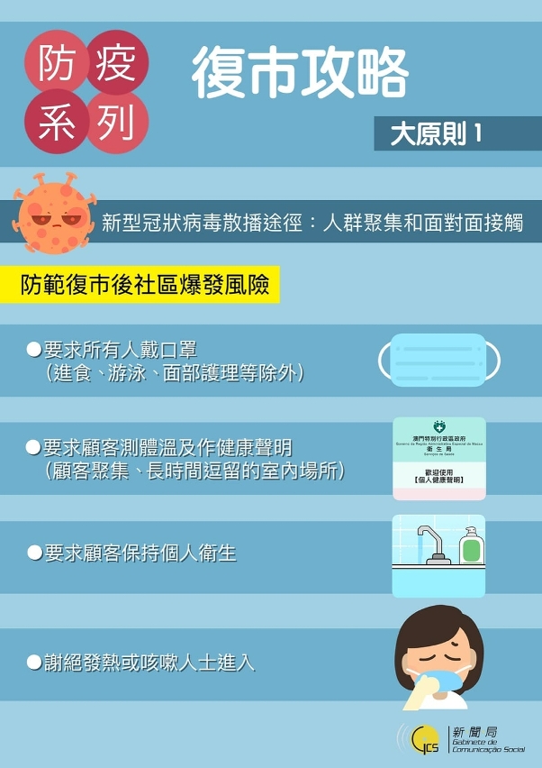 為防範復巿後增加社區內傳播病毒的風險,強烈建議每位場所負責人在恢復營運前,必須熟讀這份攻略和衛生局相關指引,大原則是對顧客進行適當管理。