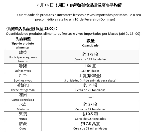 2月16日(周日)供澳鮮活食品量及零售平均價