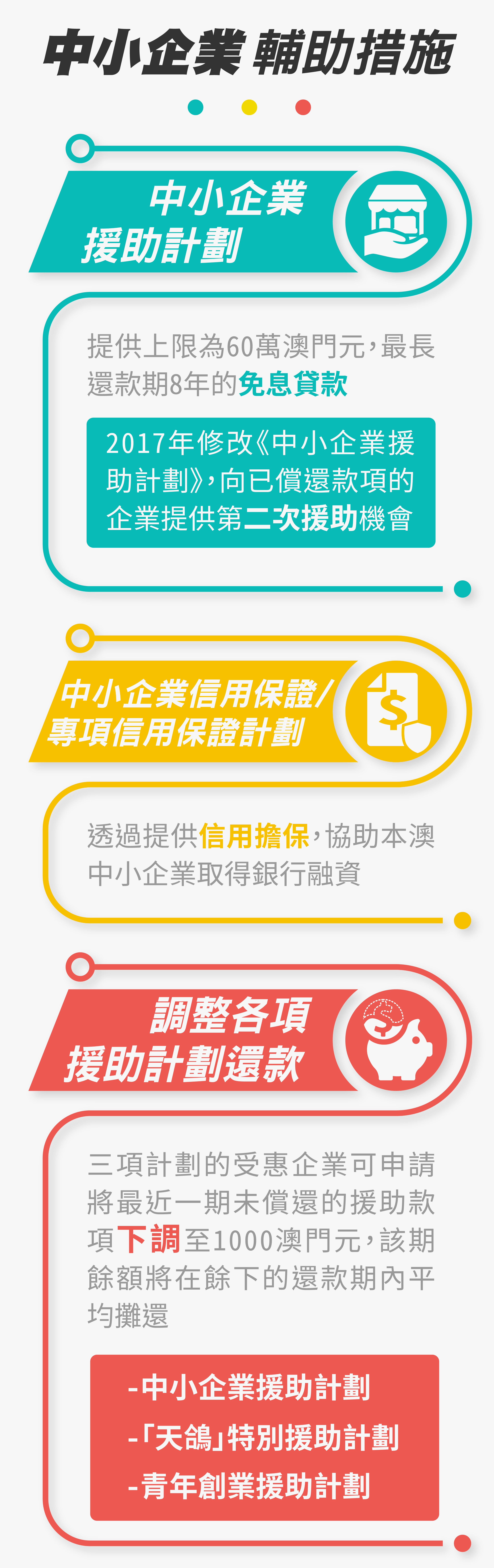 因應新型冠狀病毒肺炎對經濟民生的影響,特區政府已公佈一系列經濟援助措施。其中在中小企援助方面,新增兩項臨時性計劃,一是營運少於2年的“中小企業特別援助計劃”,另一是“中小企業貸款利息補貼計劃”。