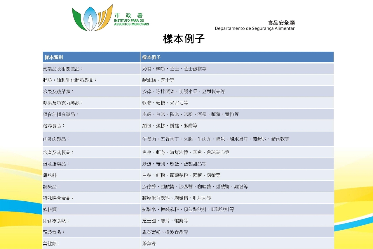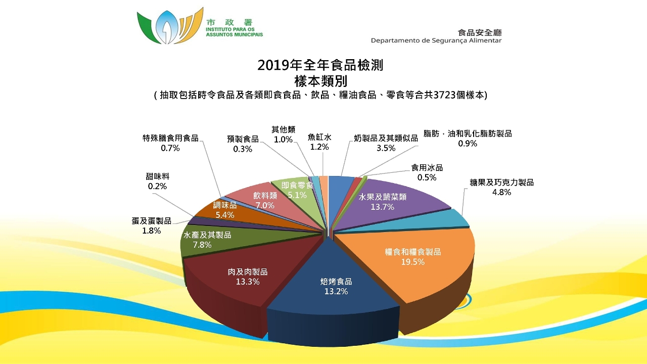 市政署於二零一九年在市面上共抽取了三千七百二十三個食品樣本,當中五十個樣本抽取自本澳經營的網上商店;總結去年食品檢測結果,有四個樣本未能通過檢測,整體合格率達百分之九十九以上。四個不合格樣本包括:一件糖椰角樣本二氧化硫含量未能通過檢測,一個流沙鹹蛋醬樣本檢出金黃色葡萄球菌含量超出標準,一件芒果慕絲蛋糕樣本檢出沙門氏菌含量超出標準,一件雲吞樣本檢出含有硼酸。市政署已對上述四個不合格樣本作即時跟進處理,要求涉事商戶停售及銷毀有問題產品,協助追查來源;亦即時發出新聞稿公佈有關情況,阻截風險蔓延。