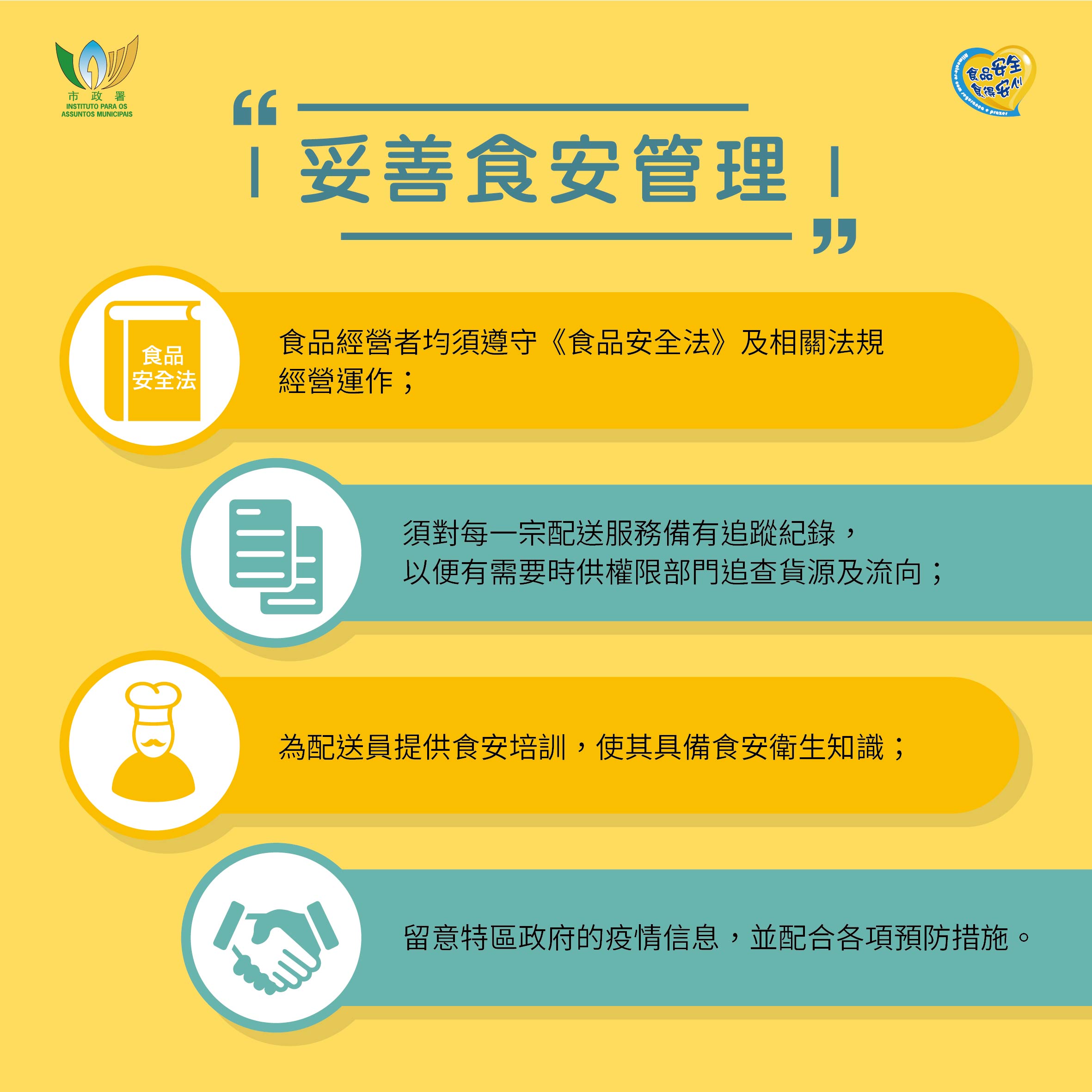 為提升本澳食品業界的食品安全與衛生意識,市政署持續派員走訪本澳食品生產經營場所,派發指引、小冊子及海報,指導商戶正確執行預防工作。亦製作了《外賣配送服務的食安注意事項》圖文包,提醒業界在提供外賣配送服務時,須注意的食品安全、個人及環境衛生,共同降低疾病在社區傳播的風險。
