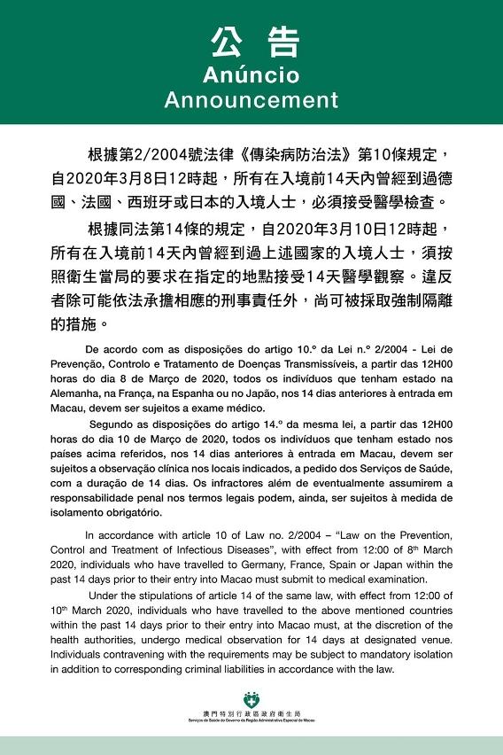 新型冠狀病毒感染協調中心表示,鑑於德國、法國、西班牙和日本新型冠狀病毒感染疫情近期趨嚴重,衛生局根據第2/2004號法律《傳染病防治法》第10條規定要求自2020年3月8日12時起,所有在入境前14天內曾經到過德國、法國、西班牙或日本的入境人士,必須接受醫學檢查。