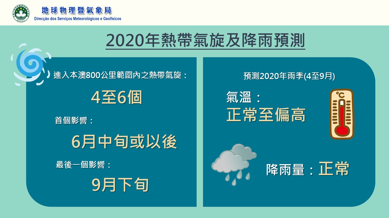 地球物理暨氣象局根據最新資料,展望今年(2020年)約有4至6個熱帶氣旋進入本澳800公里範圍內,數量接近正常,其中可能有強颱風或以上級別,預料風季將在6月中旬或以後開始,約於9月下旬結束。同時預測雨季(4至9月)降雨總量屬正常範圍,氣溫為正常至偏高。本澳快將踏入風雨季,氣象局請市民儘早做好防颱風、暴雨及水浸的準備。