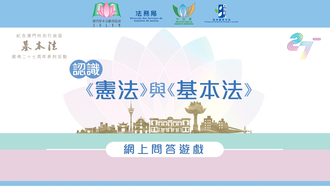 《基本法》是澳門特別行政區的憲制性法律,是保持澳門長期繁榮穩定的根本法律保障。為紀念《澳門特別行政區基本法》頒佈27周年,澳門基本法推廣協會、法務局、市政署及教育暨青年局今年將繼續舉辦系列活動,並將活動延伸至全年舉行,以便持續向社會各界傳遞及推廣《澳門特別行政區基本法》的核心內容,發揮更大推廣效益。3月31日是《澳門特別行政區基本法》頒佈紀念日,在這個重大日子將推出首項活動 ─“認識《憲法》與《基本法》網上問答遊戲”,冀透過遊戲與教育並行的方式,加深市民對《憲法》和《基本法》的認識,歡迎年滿13歲的澳門居民參加。