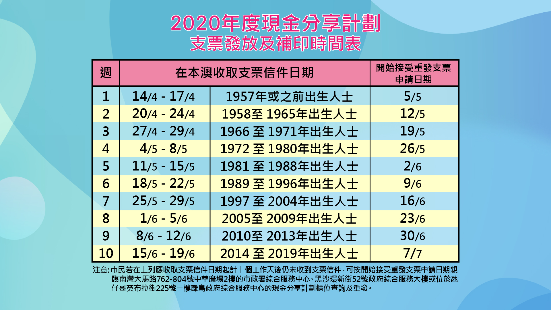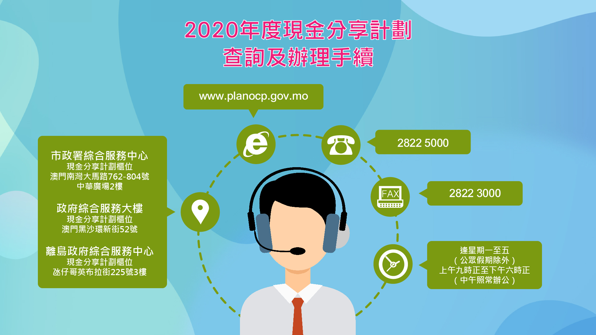 “2020年度現金分享計劃”今(1)日起發放,分別向澳門永久性居民及非永久性居民派發澳門元10,000元及澳門元6,000元。市民可透過以下方式,查閱/查詢現金分享的最新資訊: