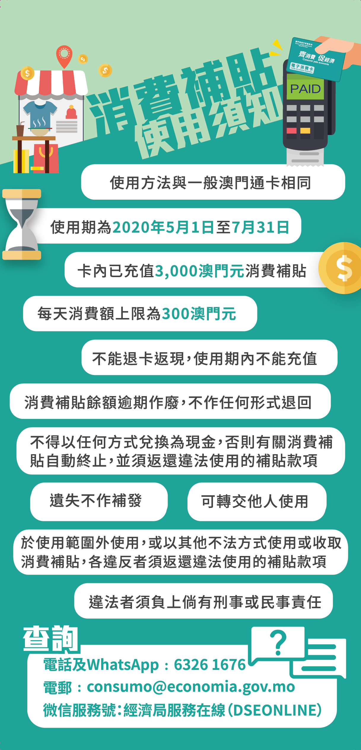 經濟局再次提醒,居民需按照《消費補貼計劃》的規定使用消費卡,不得以包括轉售在內的任何方式兌換為現金。不法使用者須返還違法使用的補貼款項,並可能導致有關消費補貼自動終止,以及承擔倘有的其他法律責任。