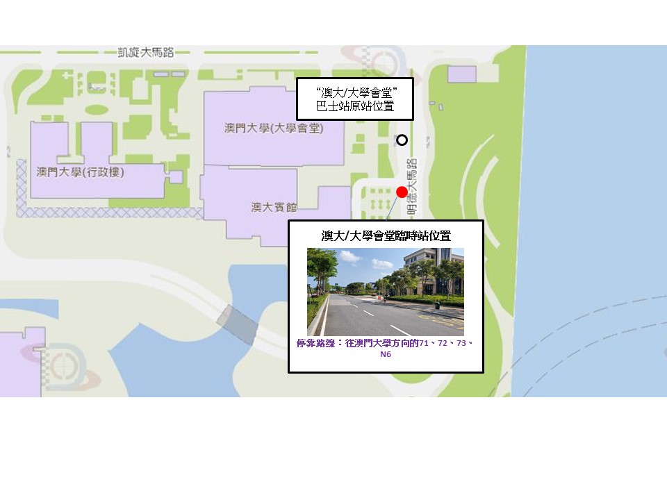 配合澳門大學校區更換候車亭工作,5月19日(周二)上午10時起,“澳大/大學會堂"巴士站臨時往大學北圓形地方向遷移約40米,供71、72、73及N6路線巴士乘客使用,工期約35日。交通事務局呼籲公眾留意。