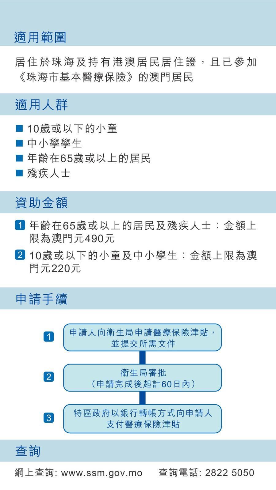 由於國家政策擴展,容許居住於內地的港澳台居民參加當地的醫療保險,珠海市於2020年1月1日起接受居住於市內的澳門居民參加珠海市基本醫療保險計劃,計劃所需費用中的財政補貼部分由珠海市政府承擔,餘下個人繳費部分由個人繳納。為協助澳門居民無障礙加入內地基本醫療保險制度,向合資格居民提供津貼,以補貼其個人繳納的費用,特區政府制定了《居住於內地的澳門特別行政區居民醫療保險津貼計劃》行政法規。