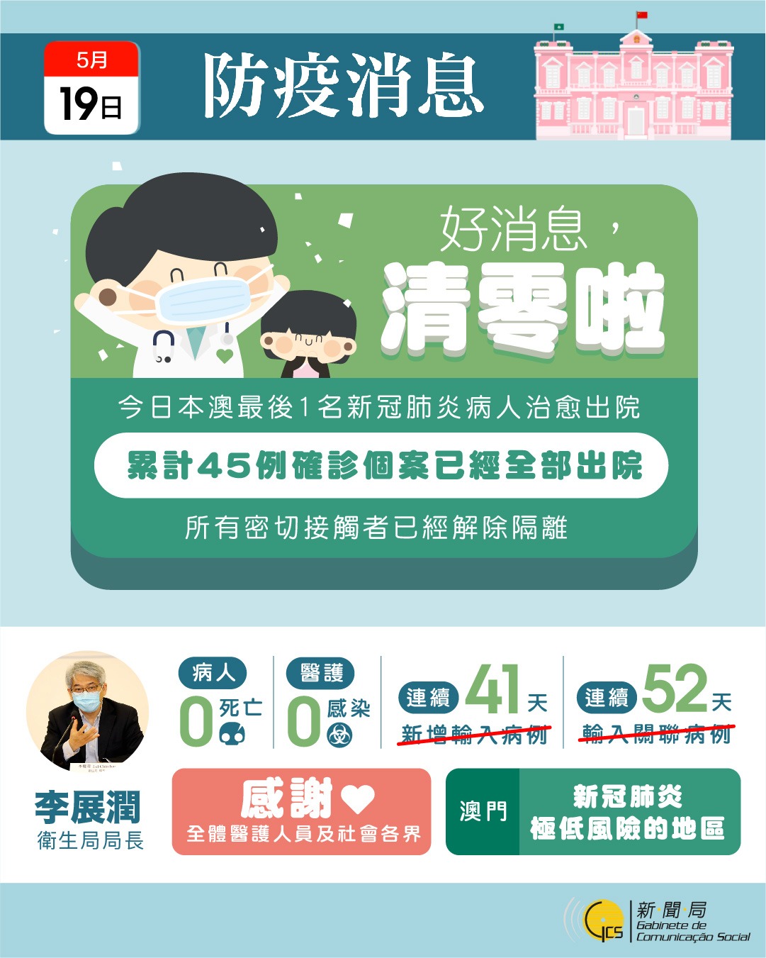 最後一名住院確診病人今治癒出院 本澳再次清零 成功維持病人零死亡、醫護人員零感染的紀錄