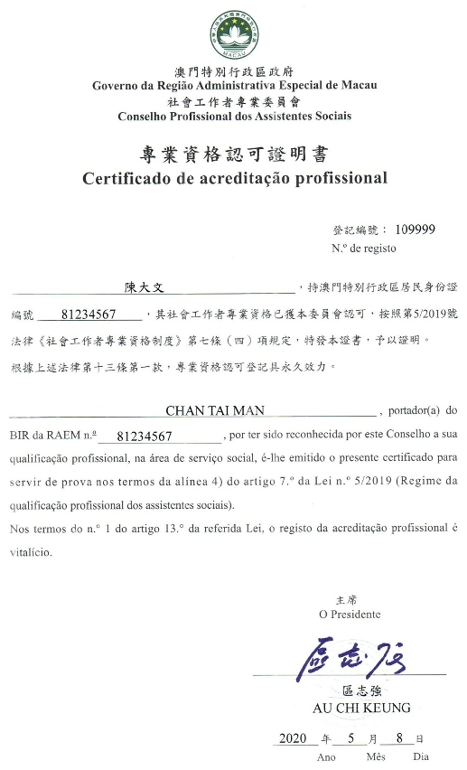 截至5月20日,共833人已通過專業資格認可,當中首輪有212人已獲批社工執業註冊。社工局會陸續上載註冊社工清單至網頁 https://www.infoswreg.ias.gov.mo/www/socialsearch ,以及安排領取專業資格認可證明書與社會工作者註冊證事宜,呼籲有關人士留意通知並盡快領證。根據法律規定,社工於執行職務時必須攜帶註冊證,且在服務使用者要求下向其出示。